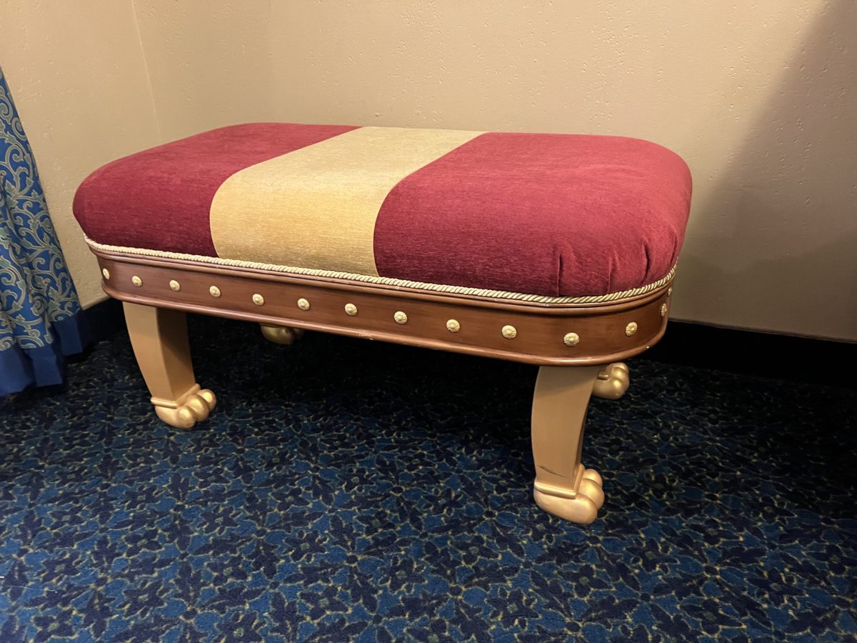 This small red and gold bench is just below the Tiana portrait, representing the enchanted ottoman from Beauty and the Beast.
