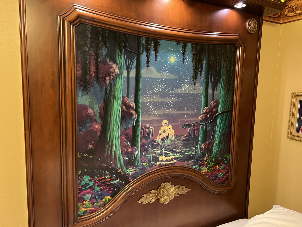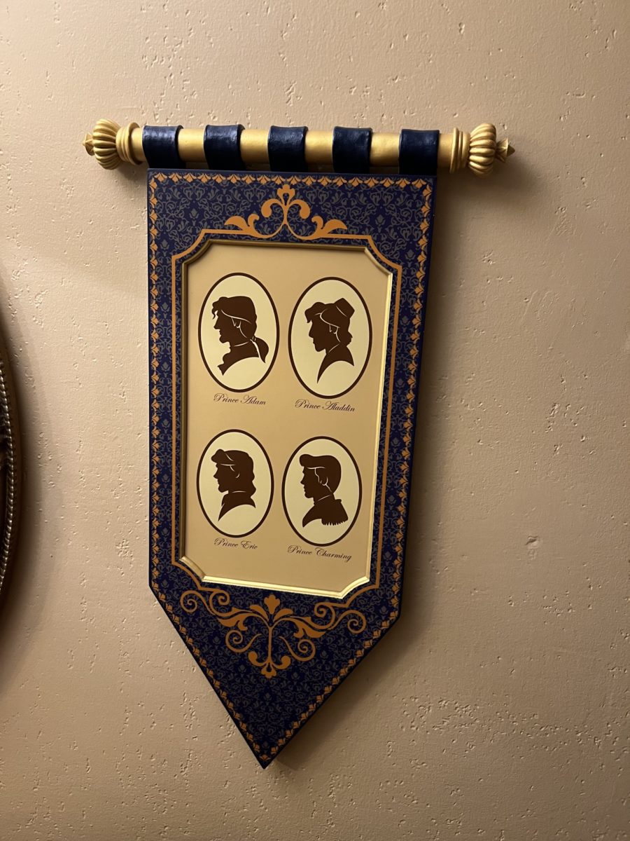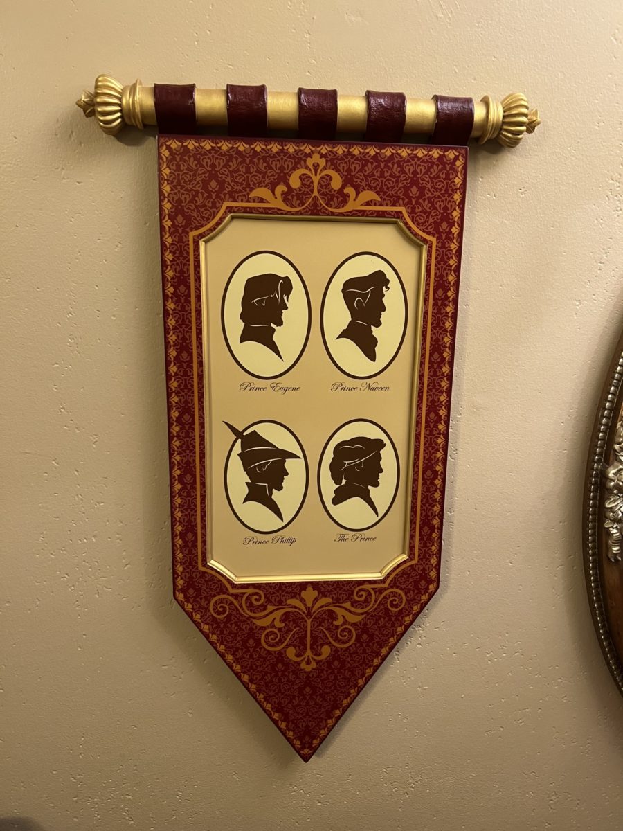 This room is Disney Princess themed, but the princes get a small nod also. There are two banners hanging to the right of the TV with silhouttes of Disney princes.