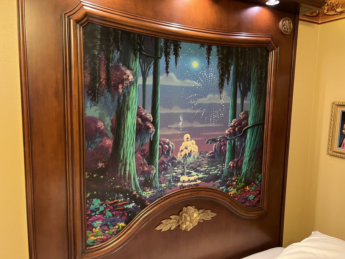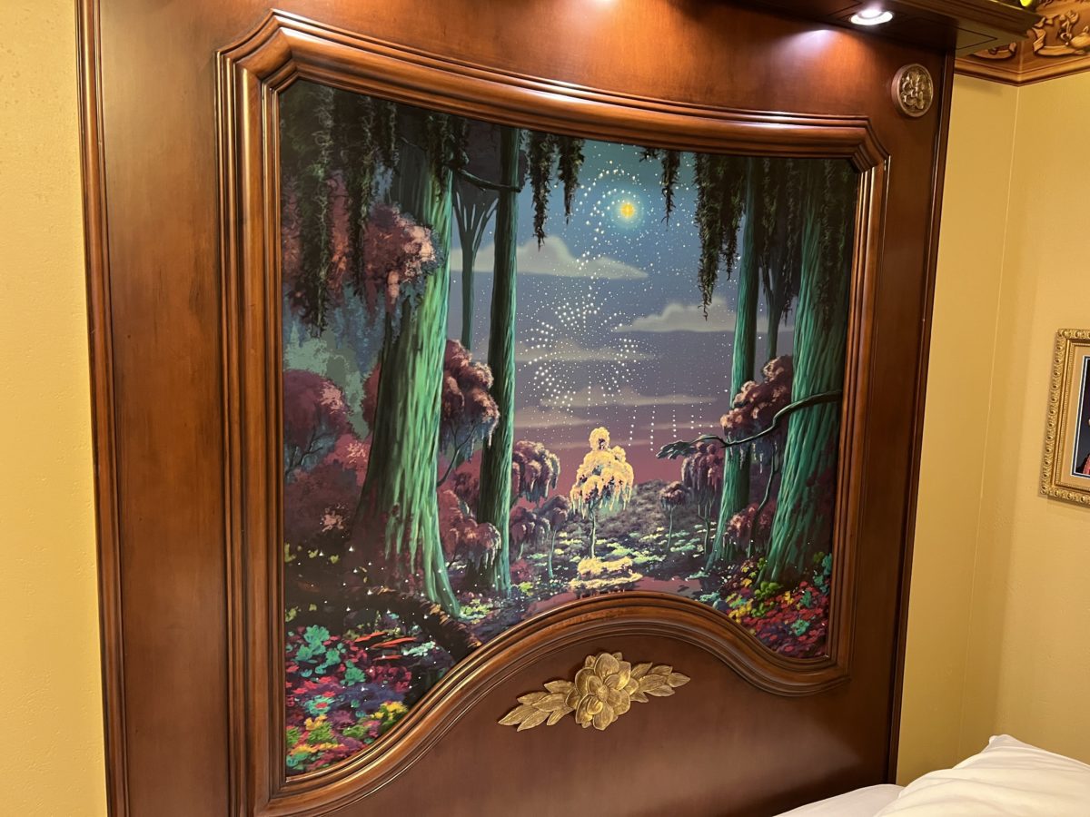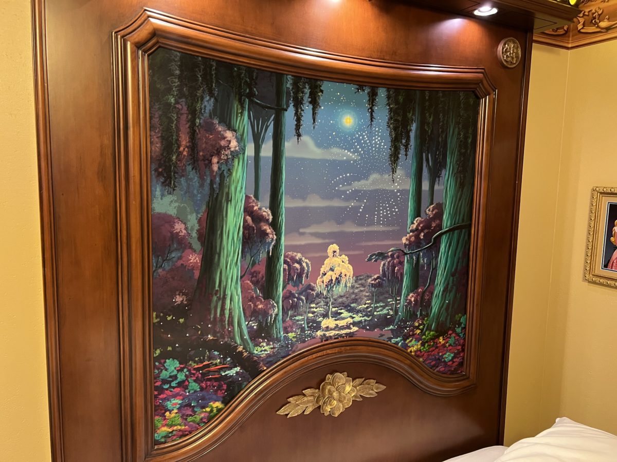 This room is Disney Princess themed, but the princes get a small nod also. There are two banners hanging to the right of the TV with silhouttes of Disney princes.