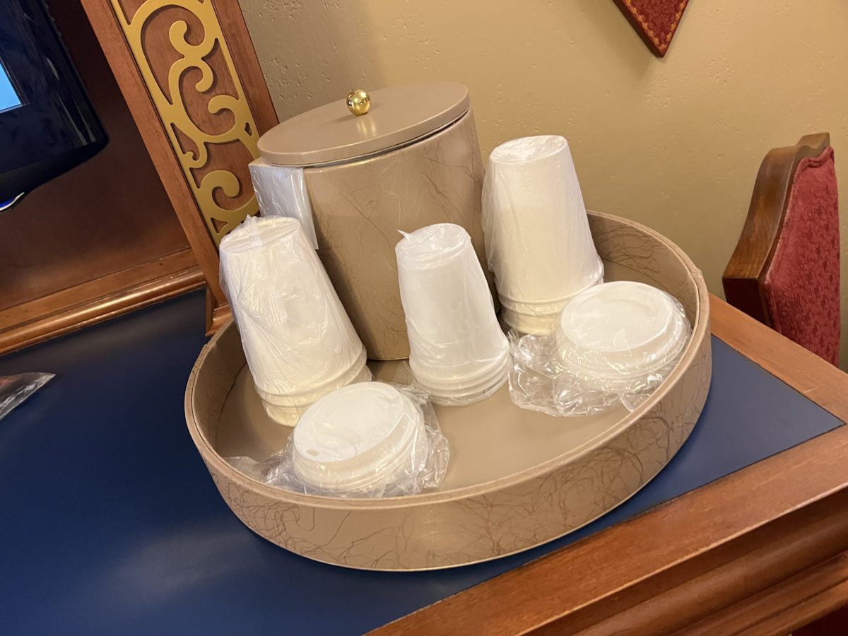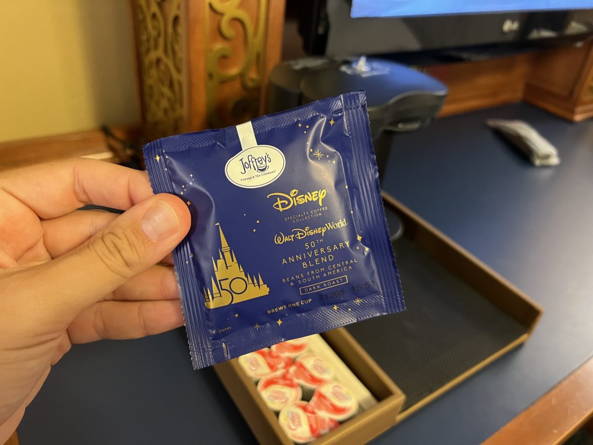 Single cup packs of Joffrey’s 50th Anniversary Blend coffee are provided.