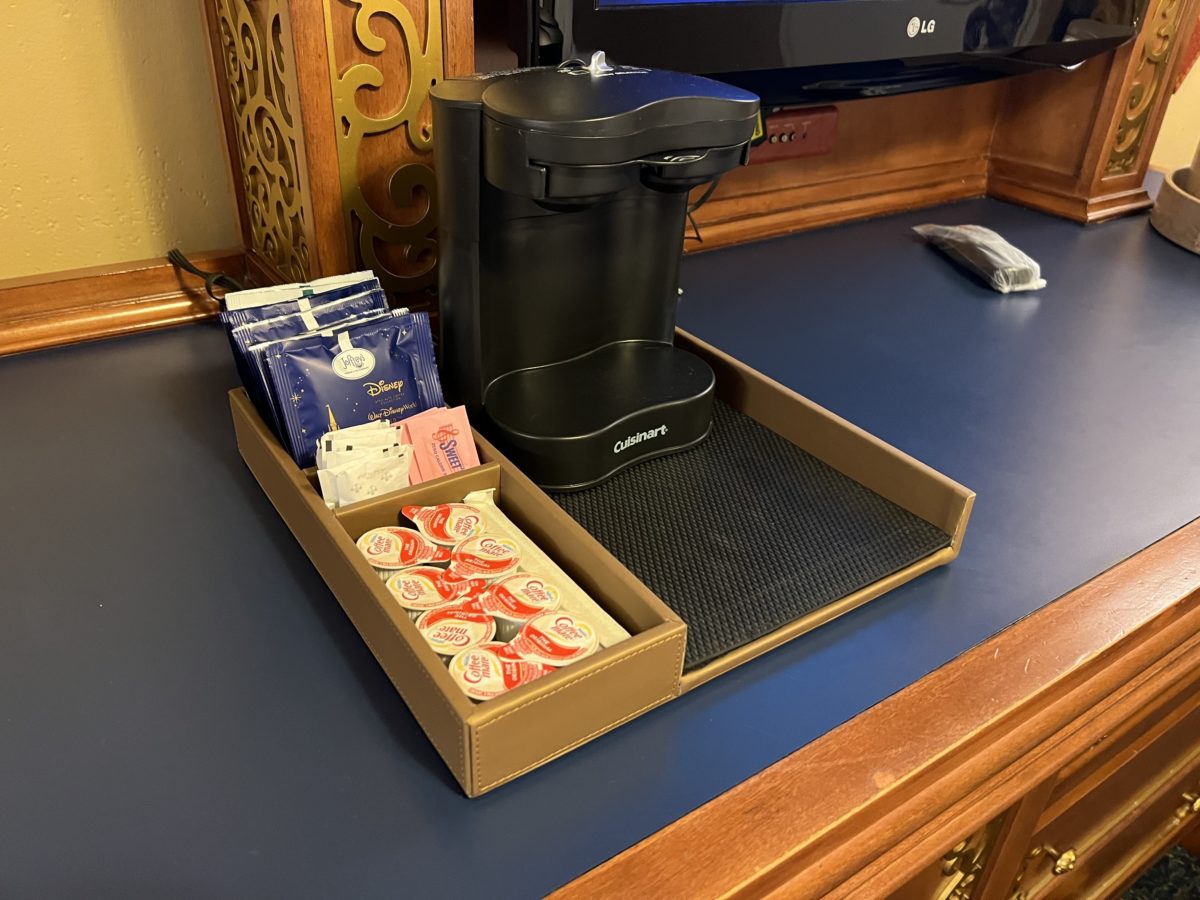 A small coffee maker and some coffee supplies sit on one side of the dresser.