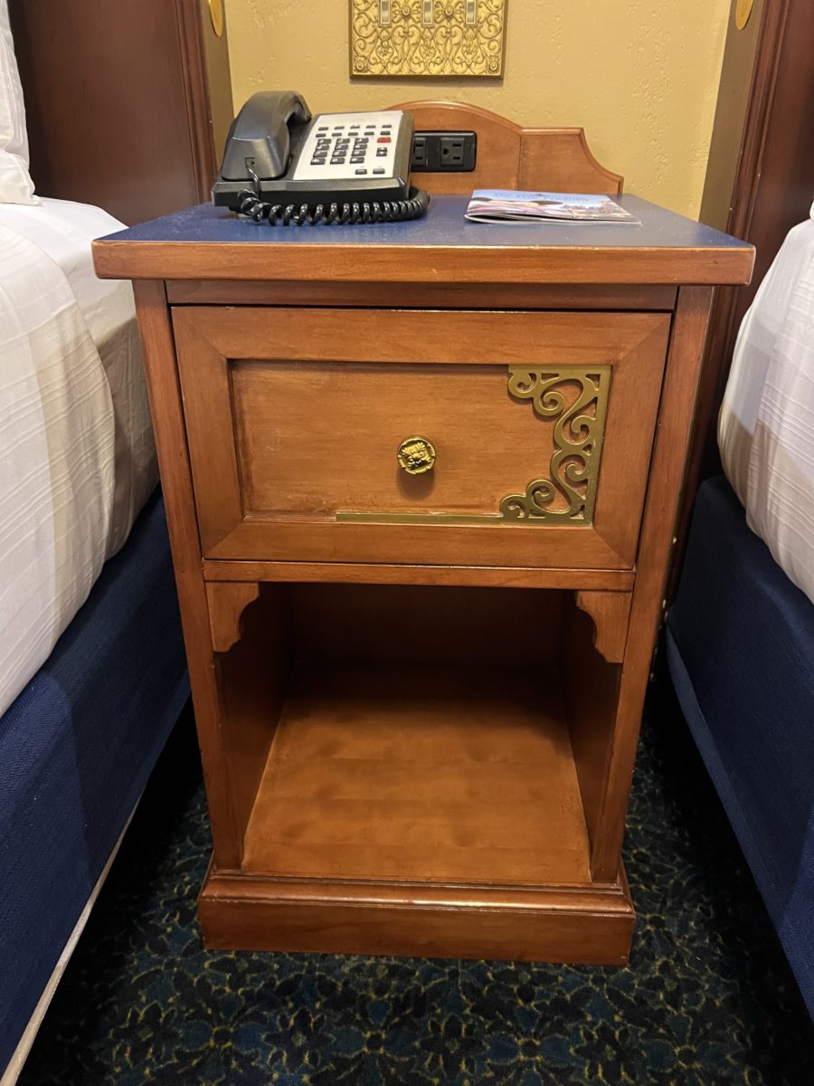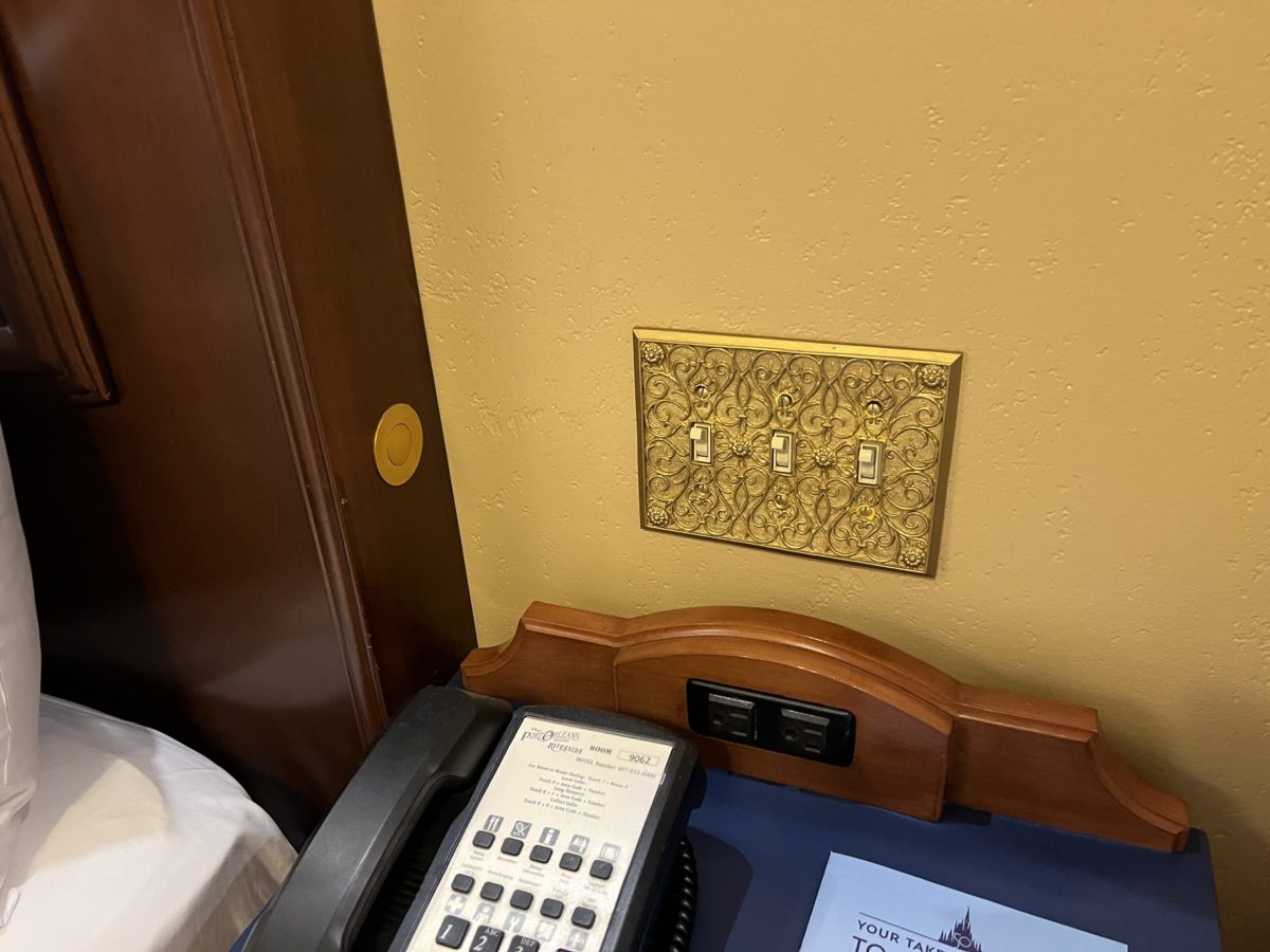 The nightstand has a blue top. A phone is provided. There are two standard outlets. Next to the light switches are buttons for the headboards.