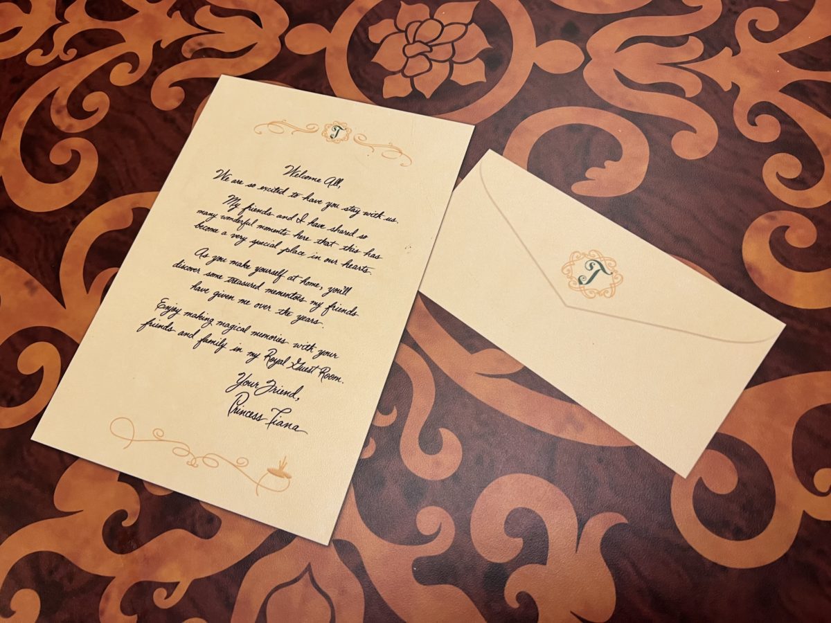 Guests will find a special welcome note from Princess Tiana “on” the table.