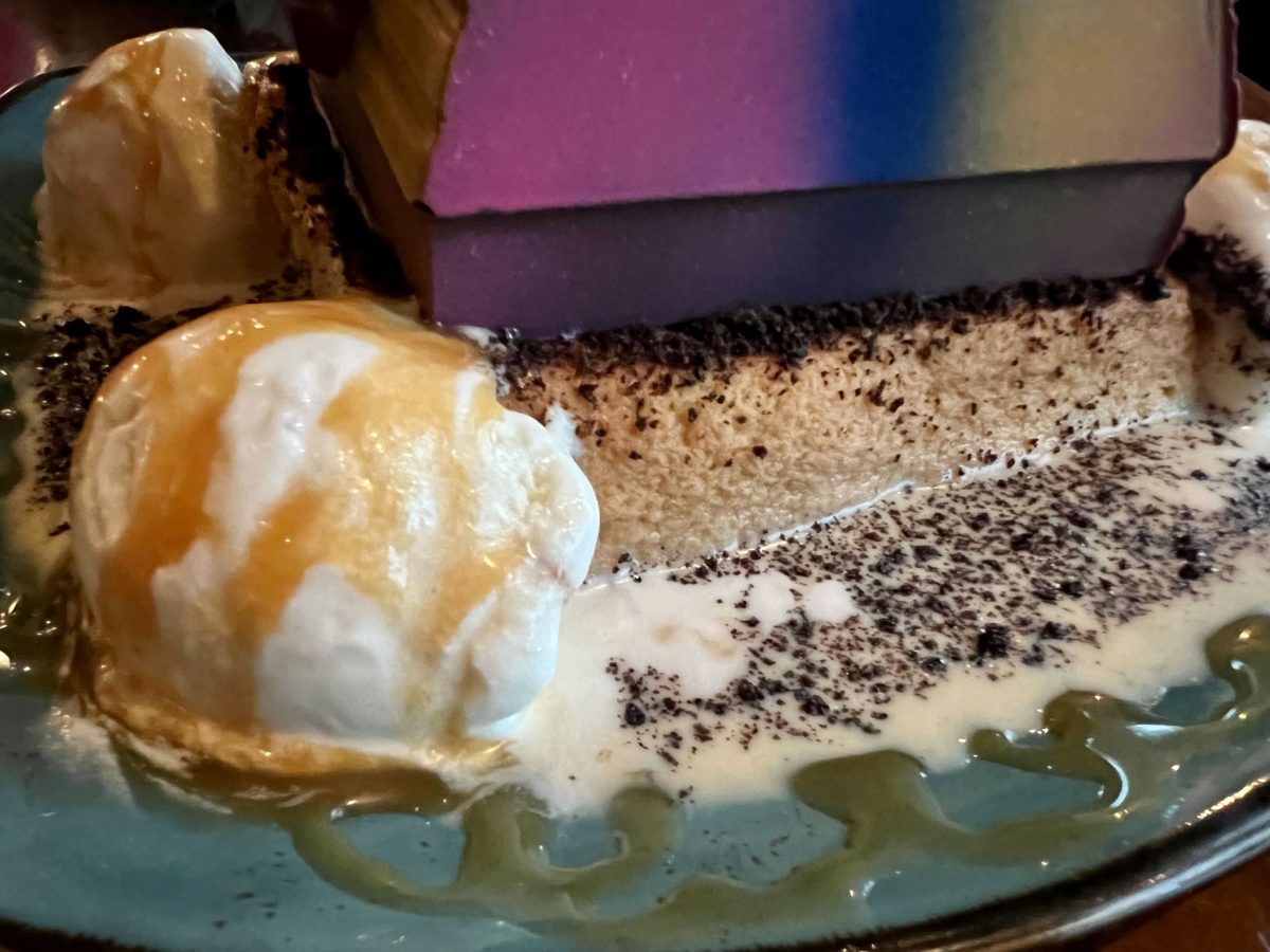 Four scoops of ice cream are drizzled with a rich caramel sauce. The cake is crumbly, but not as dry as most theme park cakes. It absorbs everything well, a perfect pairing.