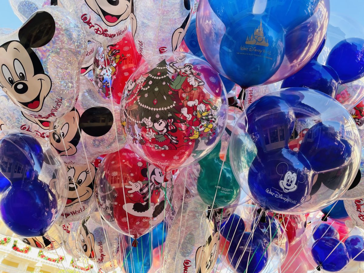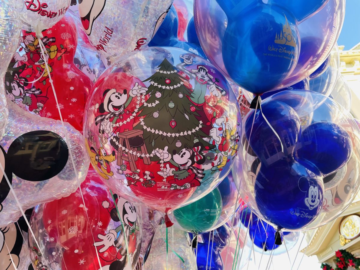 A new holiday balloon was spotted on Main Street, U.S.A.. Mickey and friends decorate a Christmas tree with popcorn garland. You can pick up your balloon for $15.