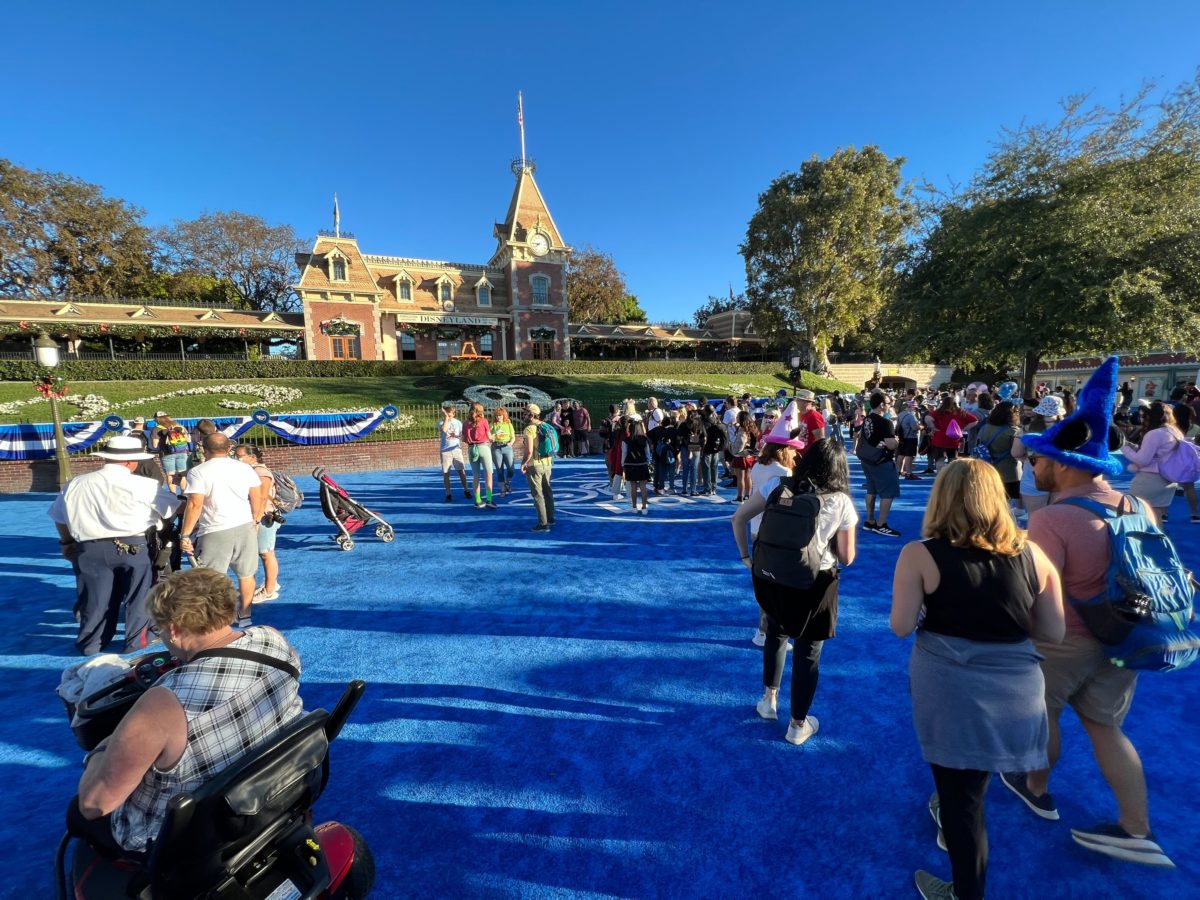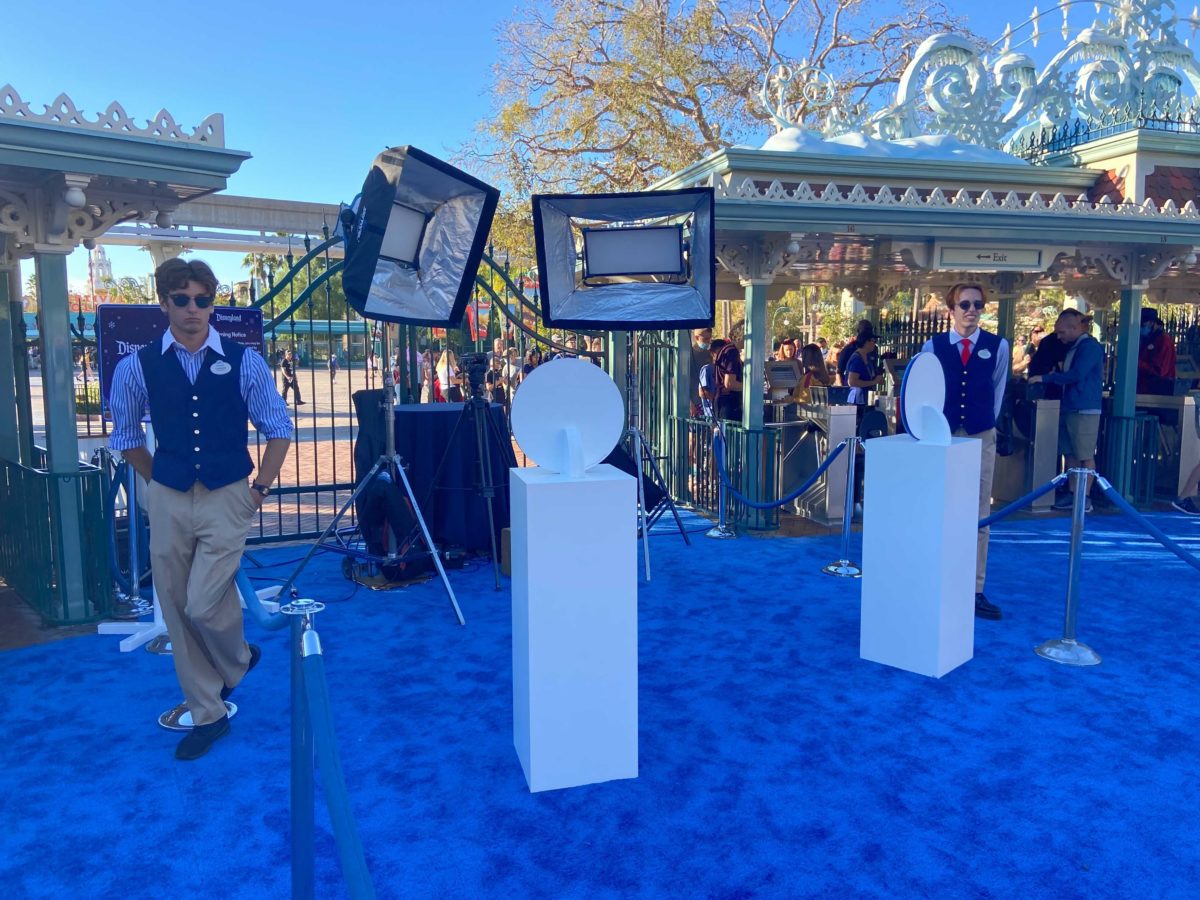 In front of the Main Street, U.S.A. railroad station, the blue carpet was rolled out, with blue and white bunting hung on the fence.