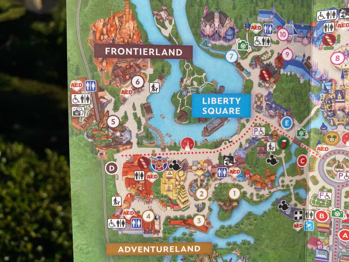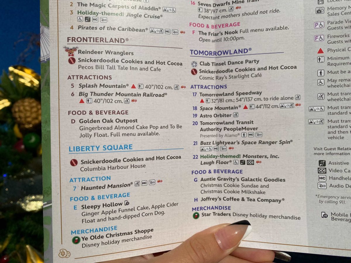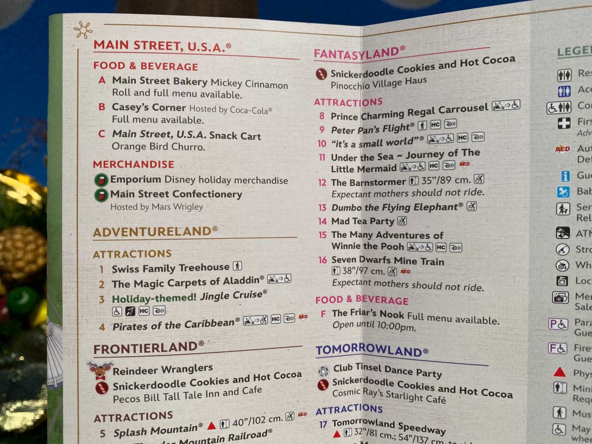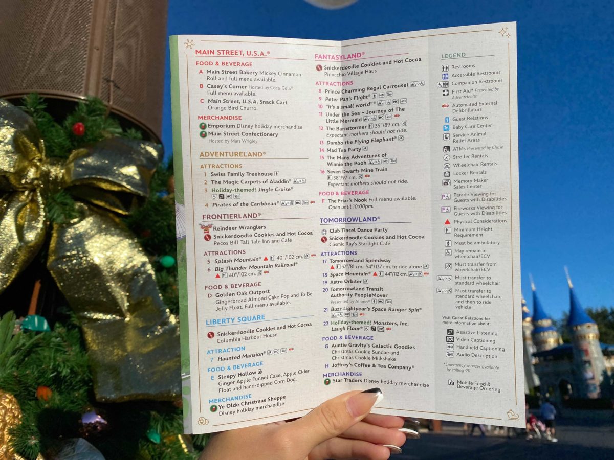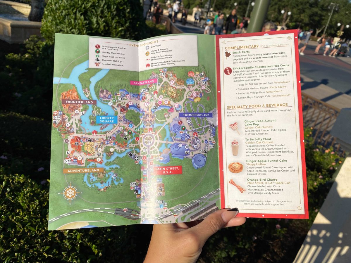 The map is a standard Magic Kingdom map with a few extra symbols to indicate where holiday treats, merchandise, Magic Shots, characters, and entertainment will be.