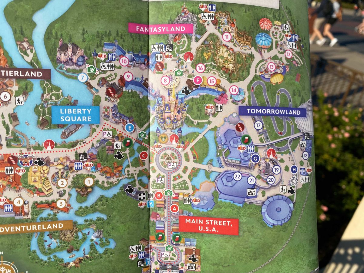 Character sightings are marked with a Mickey symbol on the map itself. Disney PhotoPass Magic Shots are marked with a green camera.