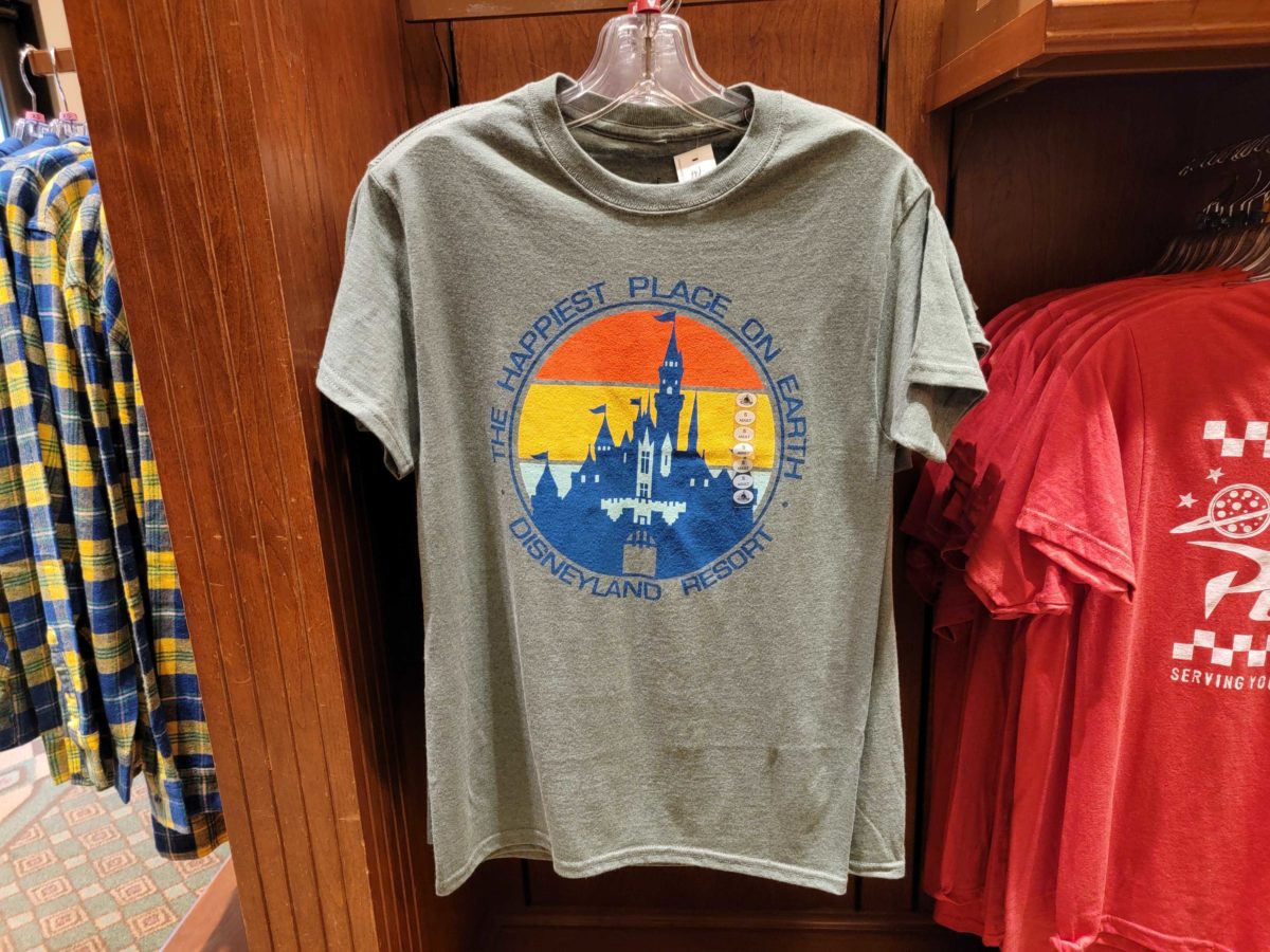 This heather grey tee has Sleeping Beauty Castle in the center against orange, yellow, and blue stripes. It says “The Happiest Place on Earth” around the castle.