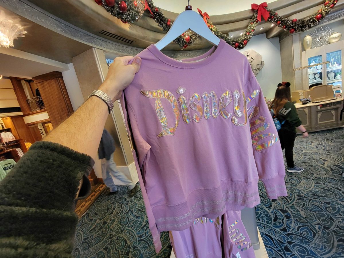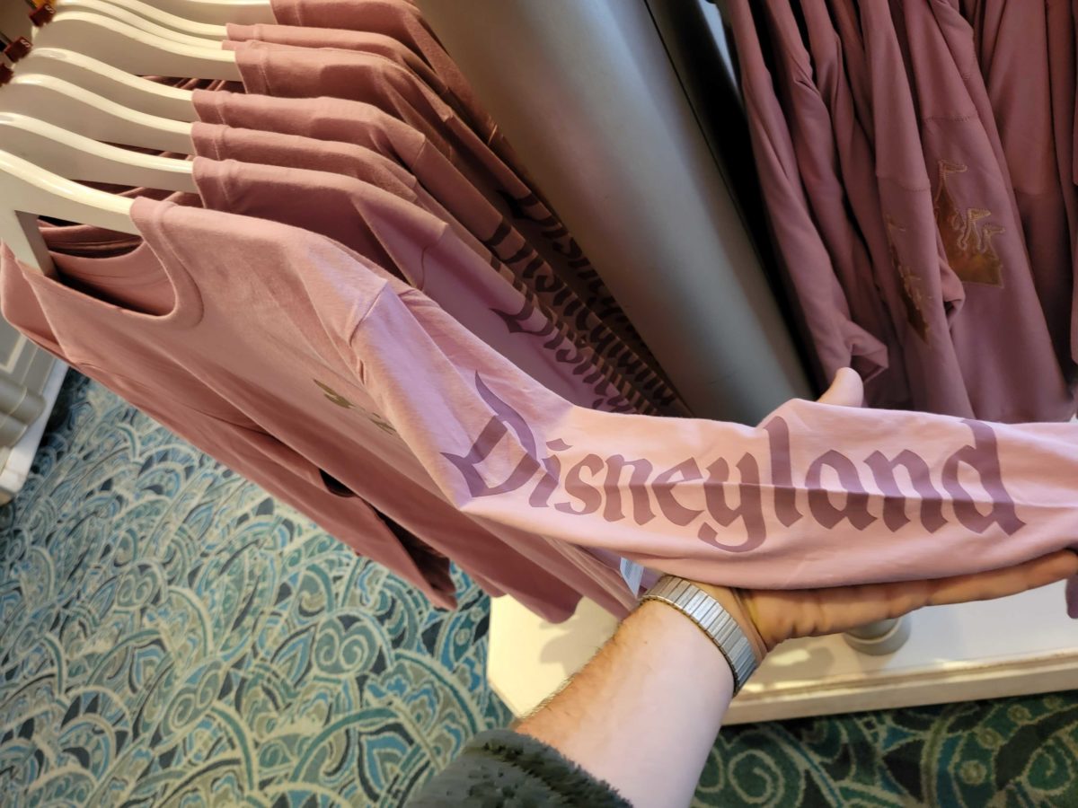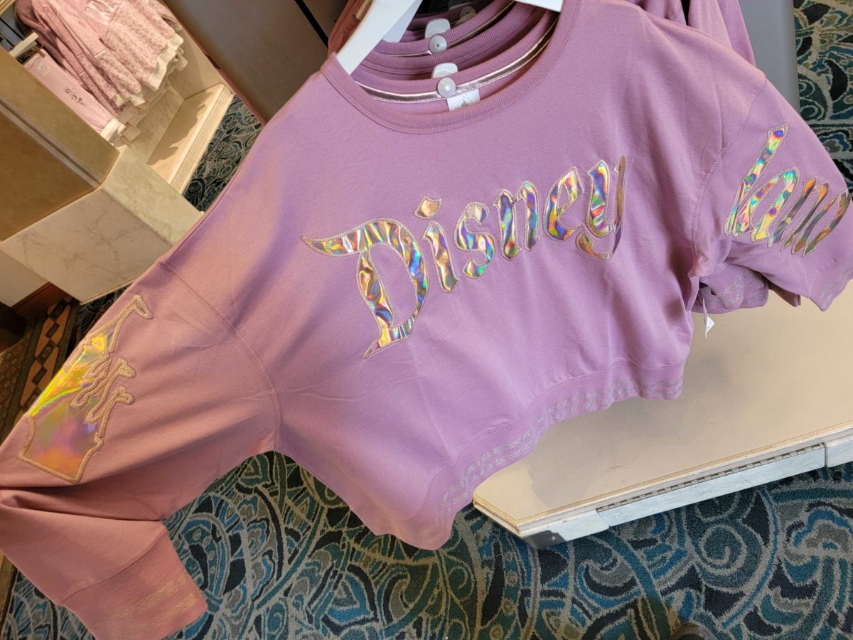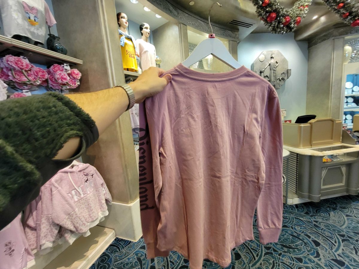 “Disneyland” is on one sleeve in a darker pink.