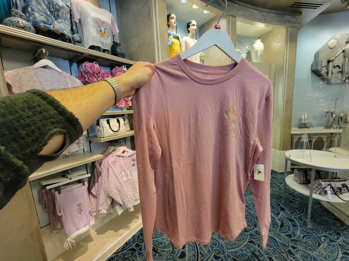 This long-sleeved shirt is also pink, with Mickey in gold on the left breast.