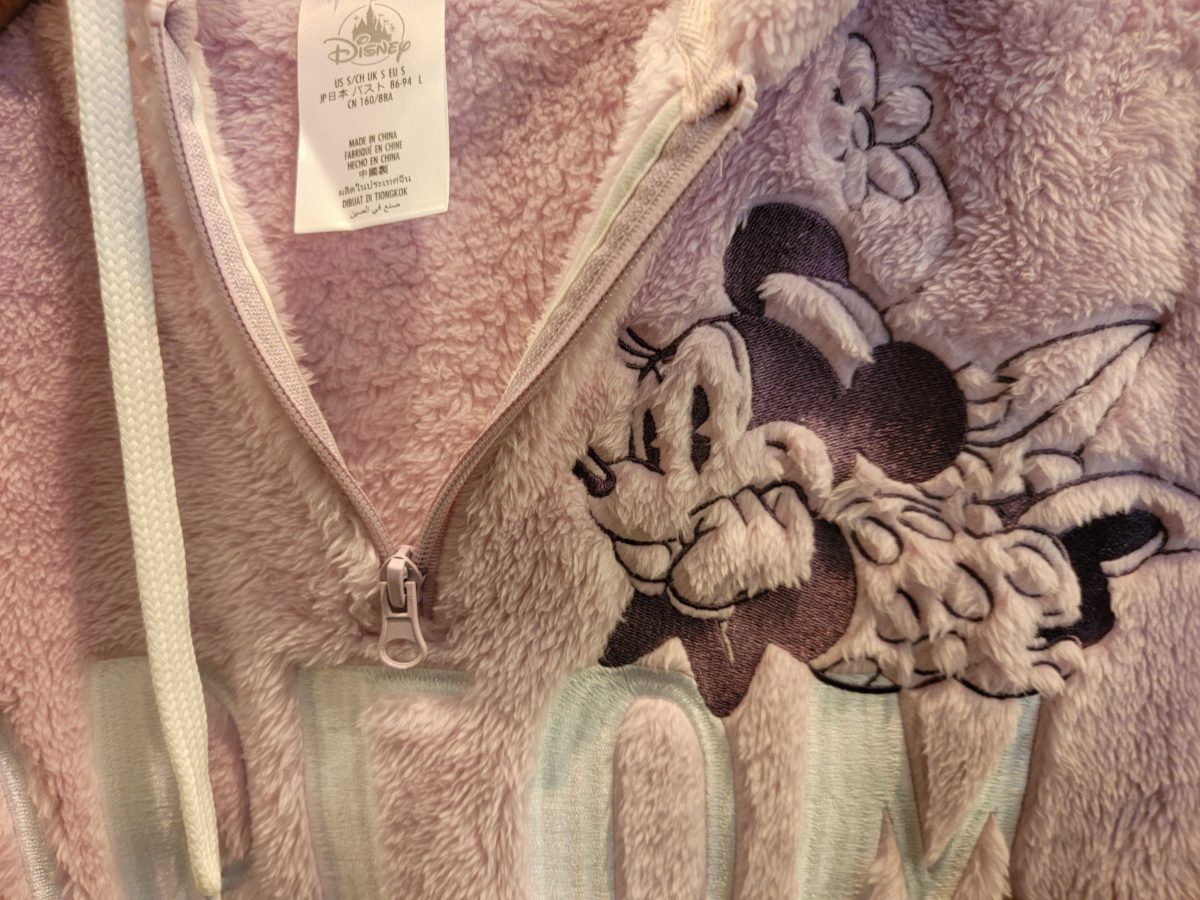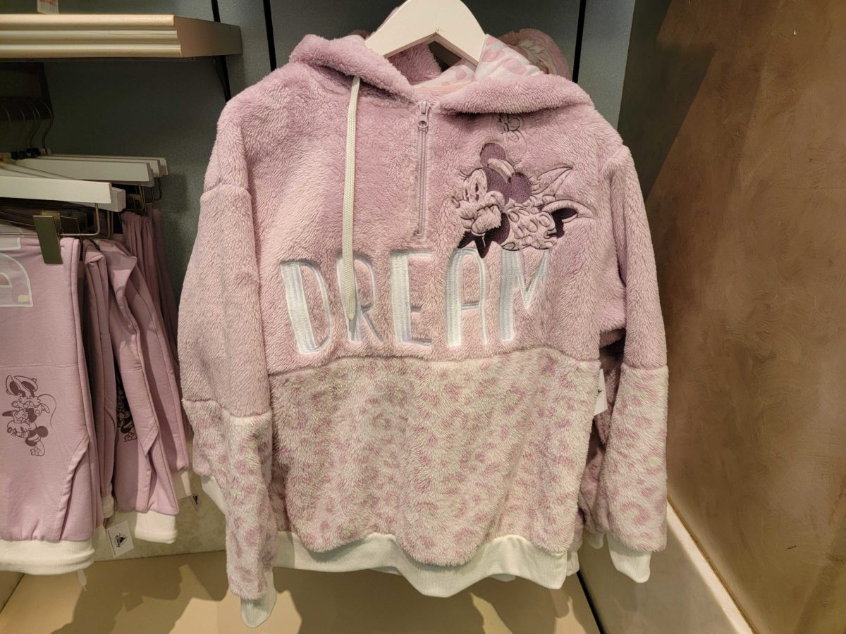 This fuzzy hoodie has leopard print on the bottom and plain pink on the top. Minnie is lounging across the word “Dream.”