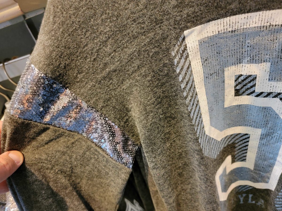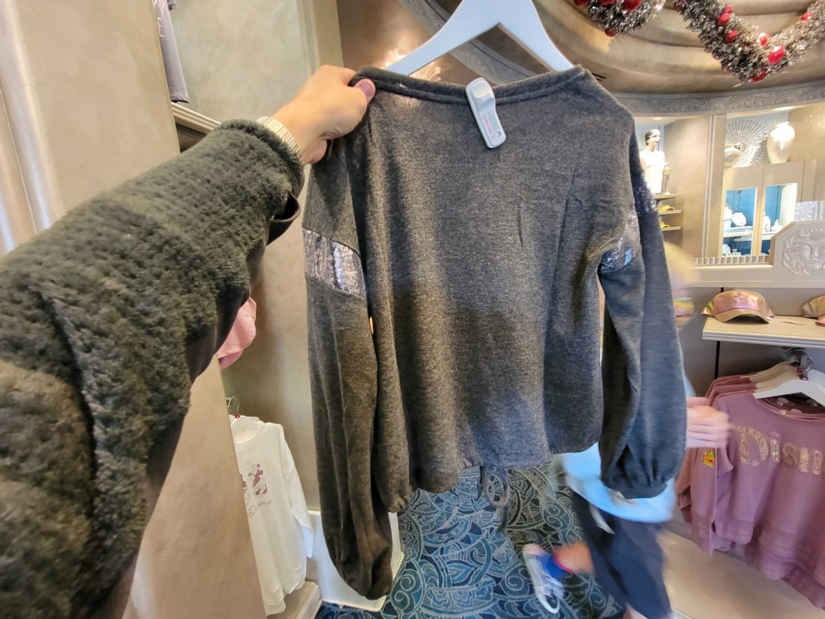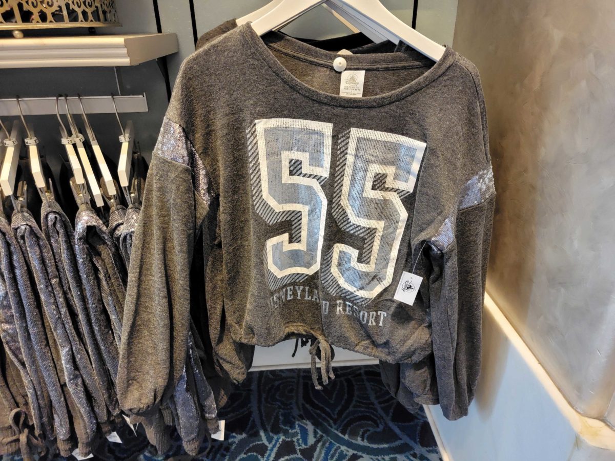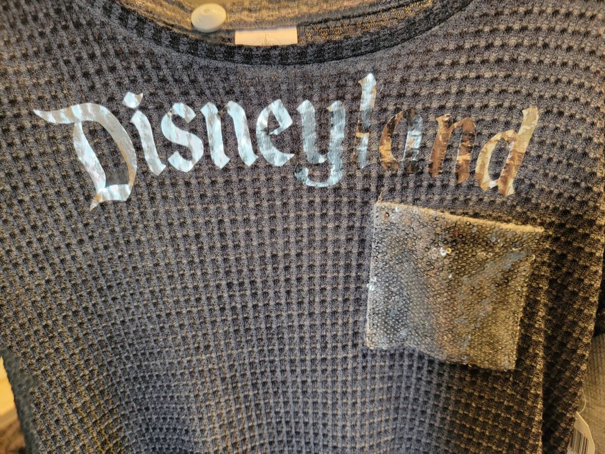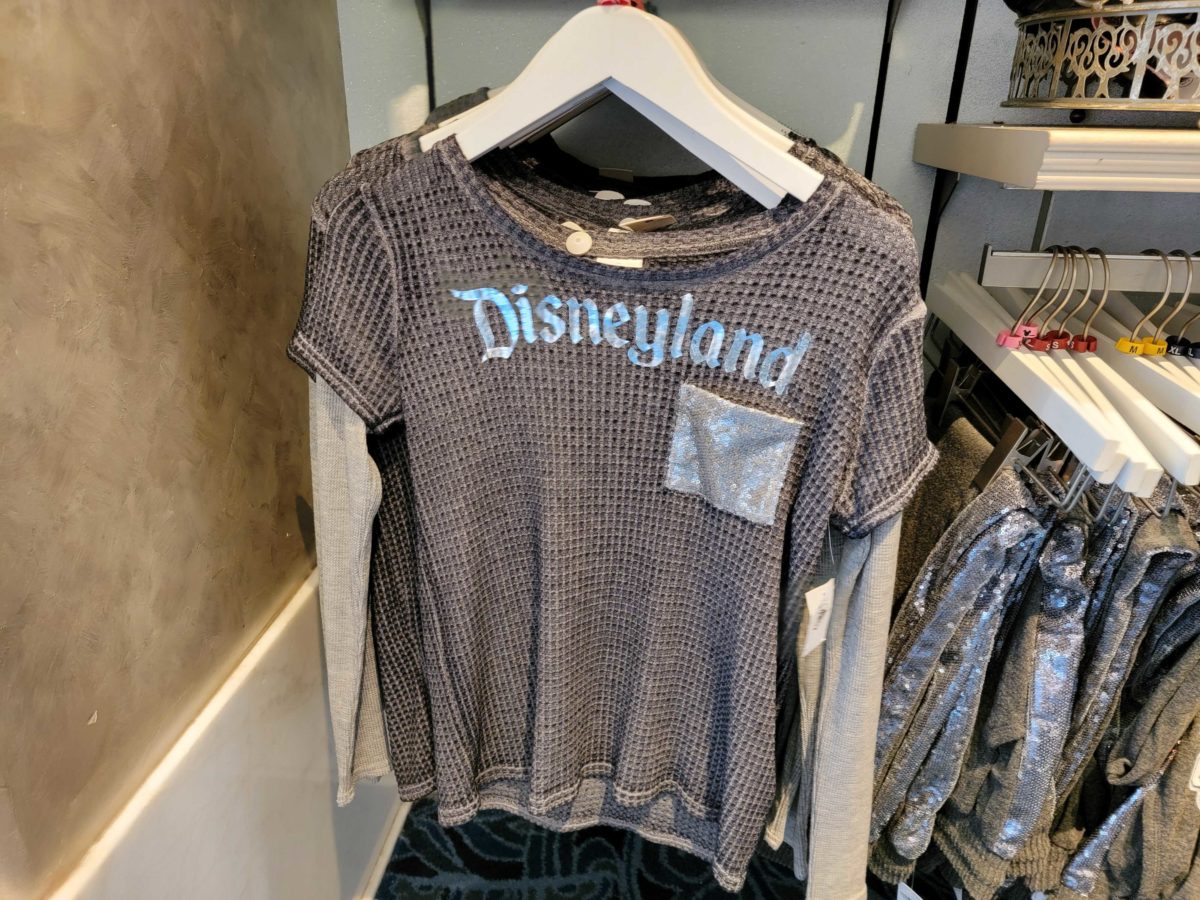 The top layer is dark grey and says “Disneyland” in shiny silver. The breast pocket is covered in sequins.
