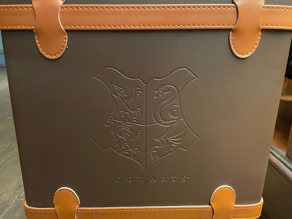 Just like the Gryffindor suitcase, the Hogwarts suitcase prominently features a simplified version of the crest on the front. This suitcase’s colors are dark brown and light brown for a more old-fashioned leather suitcase look.