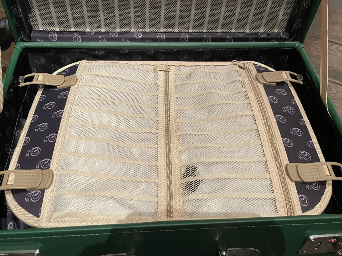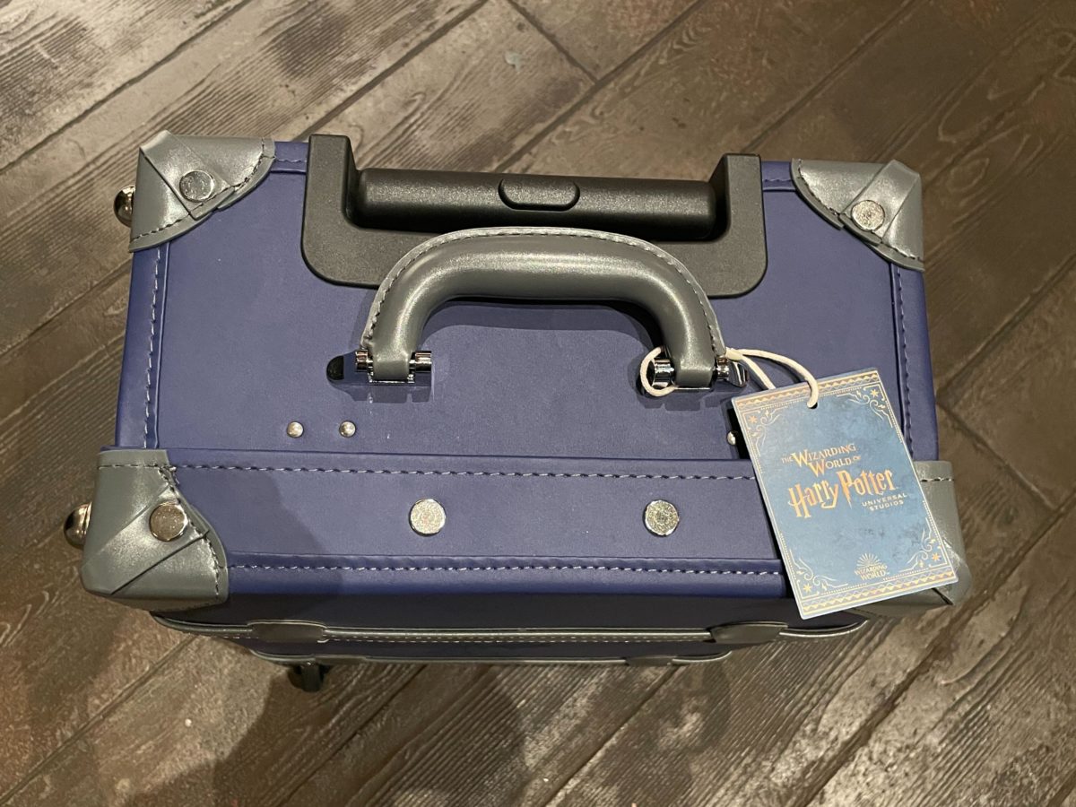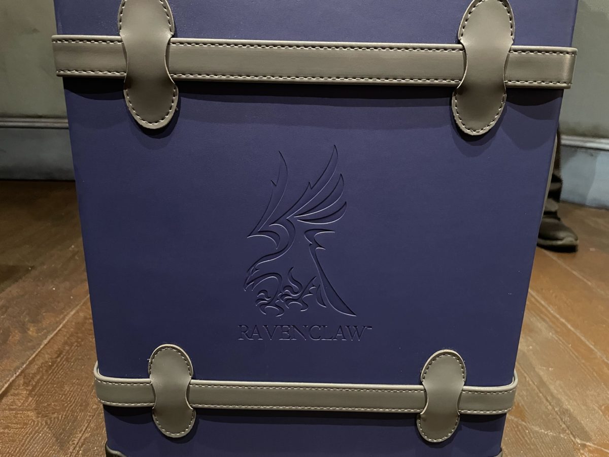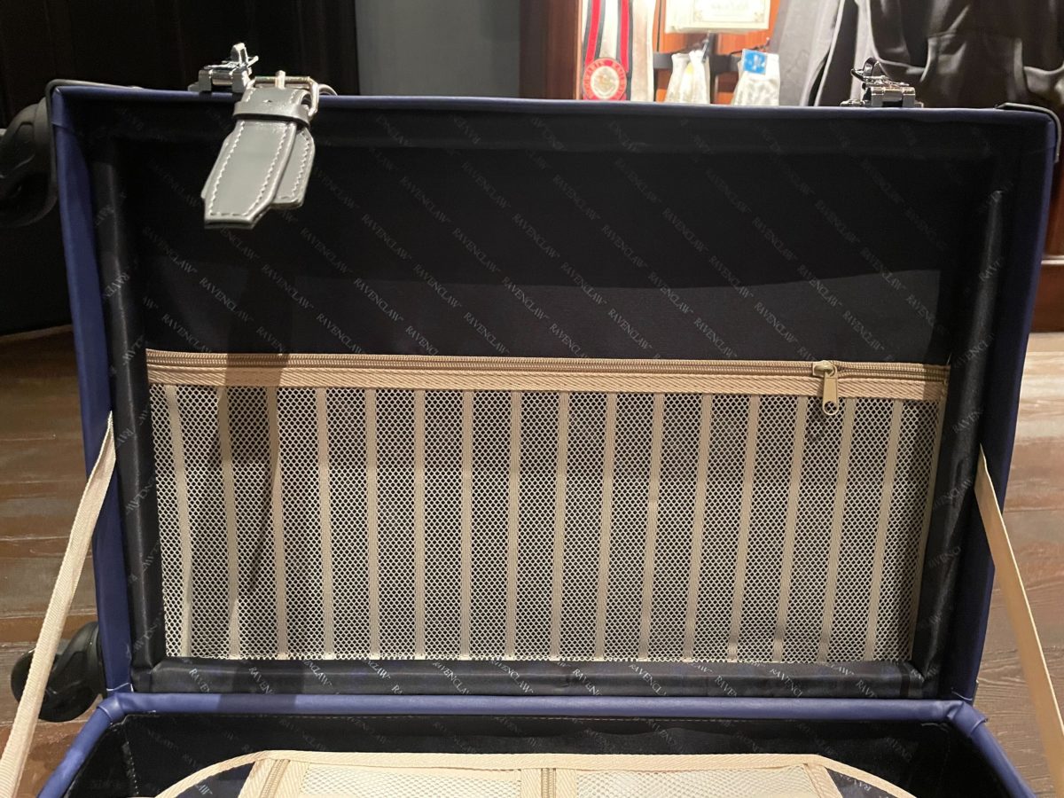 Curiously, unlike the other house suitcases, the interior lining doesn’t have the animal featured. Instead, “Ravenclaw” is repeated in gray on a black background.