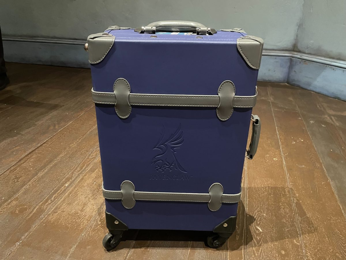 The Ravenclaw suitcase features the house’s feathered mascot embossed on the lid, while the exterior is rendered in blue and gray.