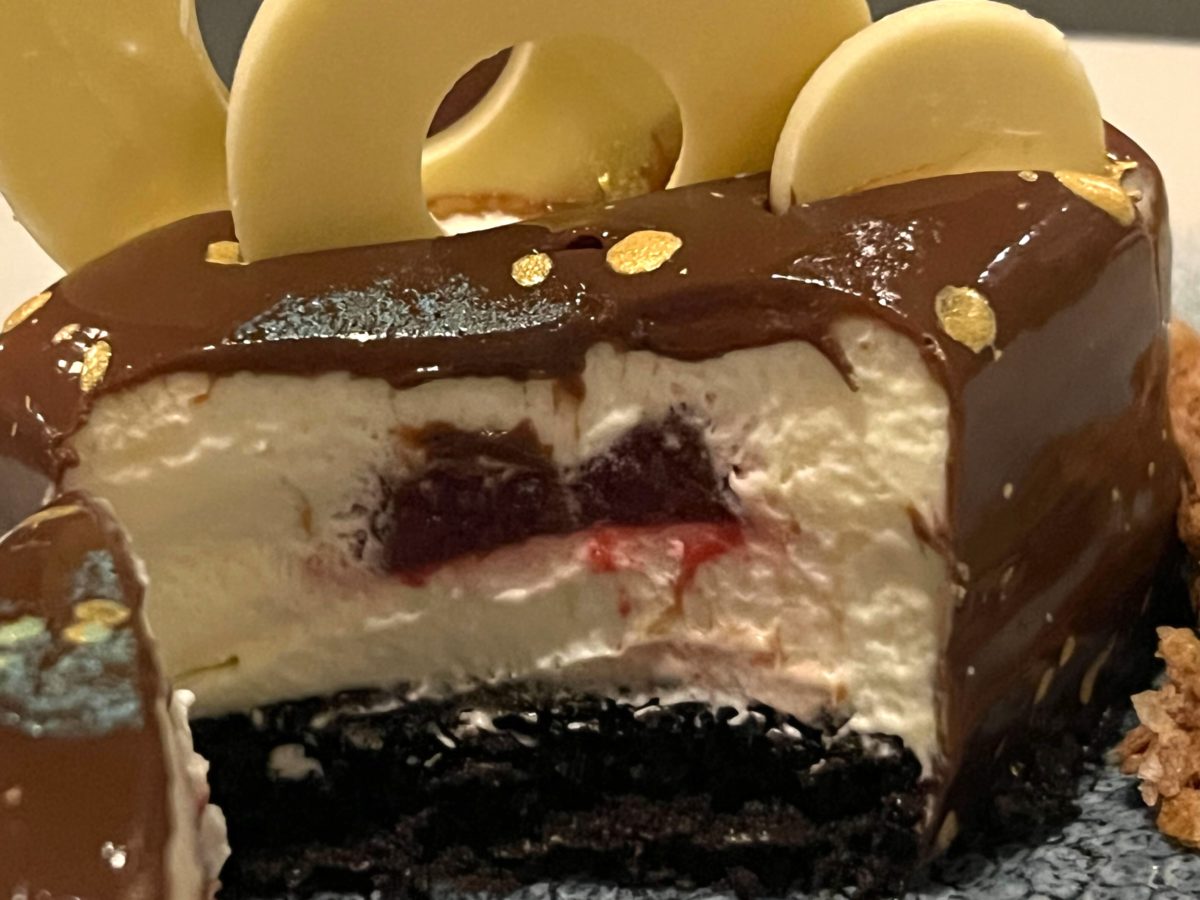 This unique take on the treat is very good. The dark chocolate cake mixed with the rich, creamy cheese-based mousse, all offset by the cherry filling is a great combination. There’s also a milk chocolate flavor that is present throughout from the exterior coating. The accompaniments of the white chocolate rings, the meringues, and the 50th chocolate decoration are unnecessary and don’t compliment this well, but they do make for a nice photograph.