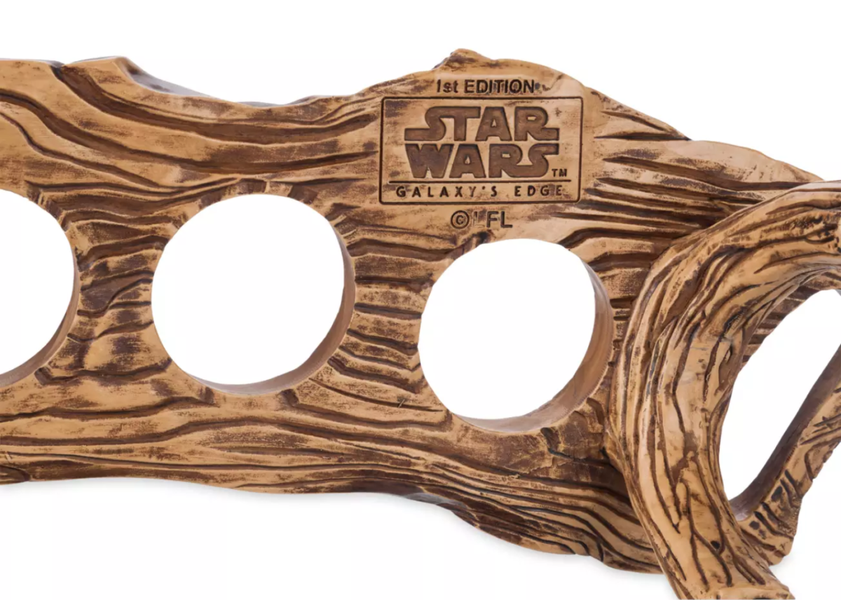 Pull up a stool and imagine yourself at Oga’s Cantina at Star Wars: Galaxy’s Edge when you drink from this set of cups created from Rancor teeth. The four glazed mugs come with a faux carved wood ”Flight board” stand, complete with carrying handles.