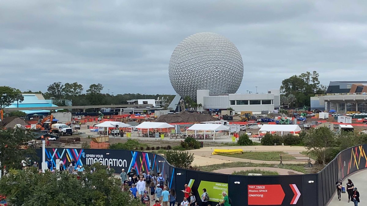 The center of World Celebration behind Spaceship Earth is entirely surrounded in construction walls.