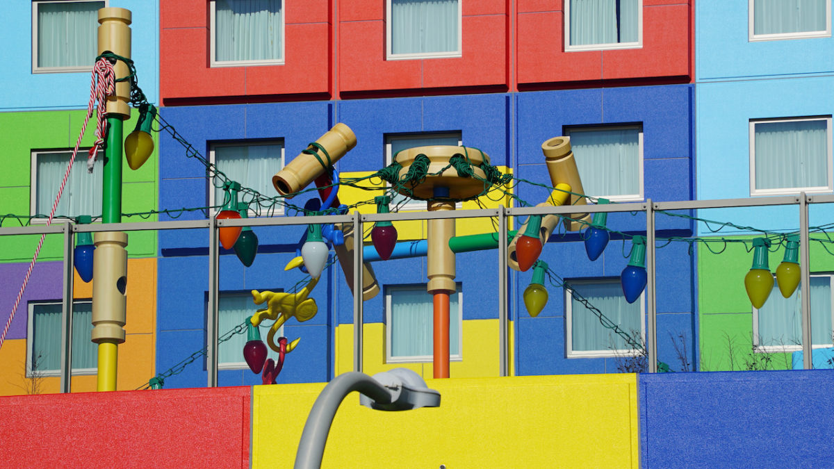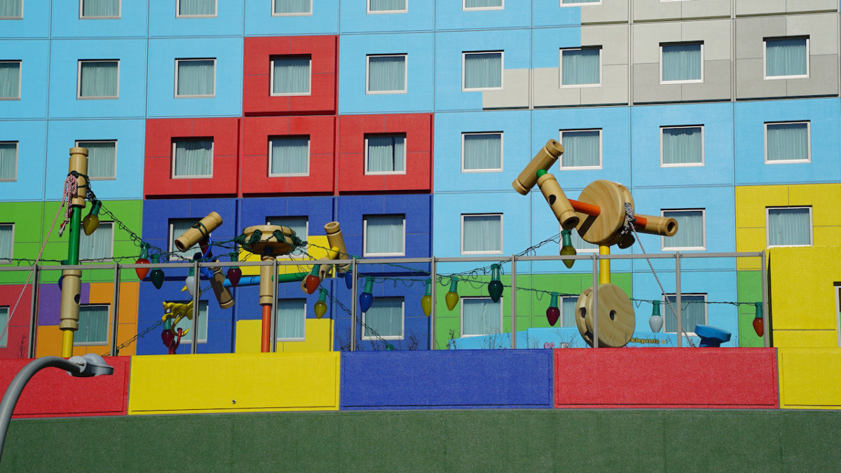 From next door, the outdoor Slinky Dog Park is visible. One of the buildings covering HVAC and other utilities is painted with crayon-esque art of the Green Army Men flying an Evil Emperor Zurg kite.