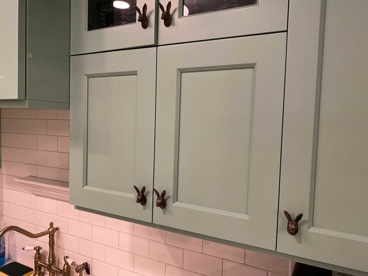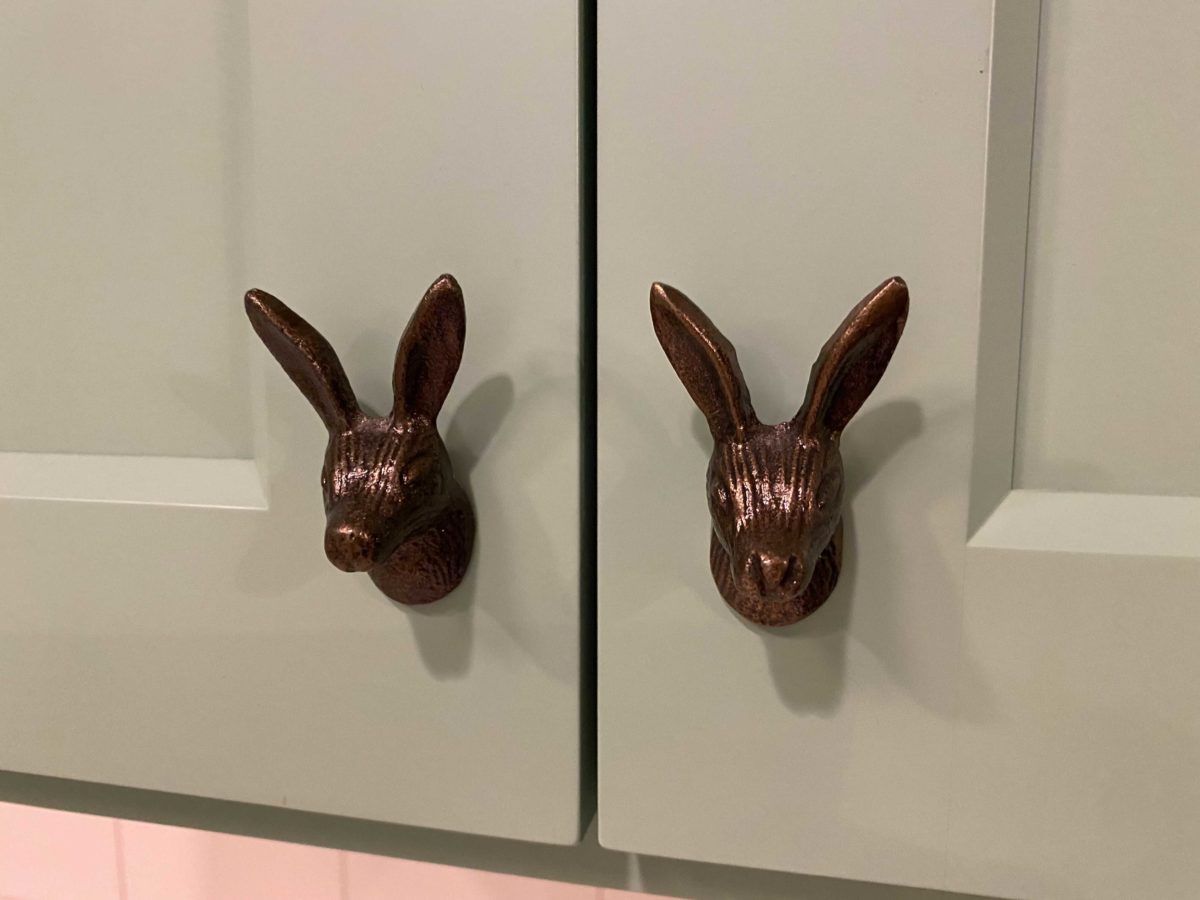 The teal cupboards have rabbit head knobs, bringing subtle theming to the space.