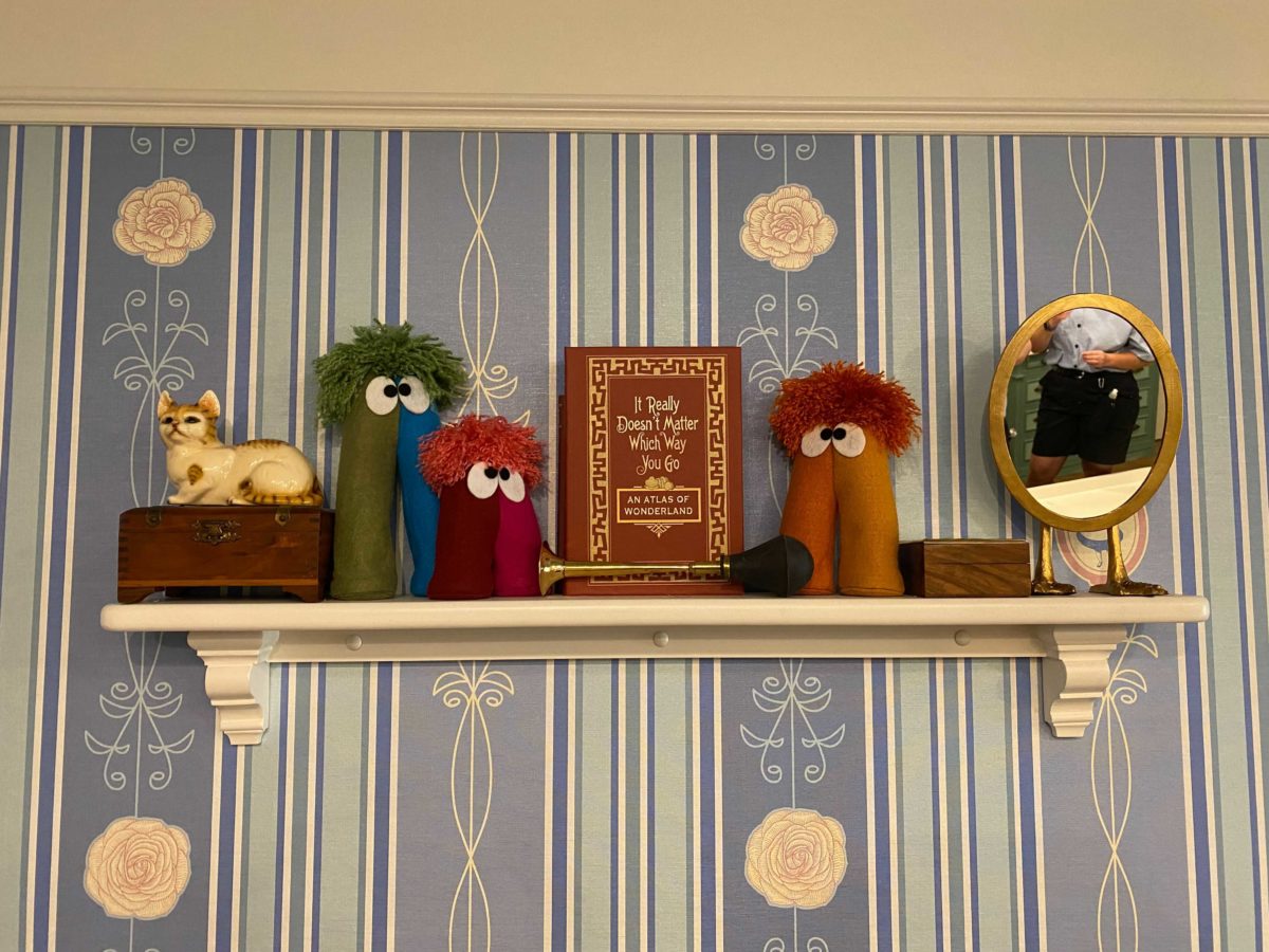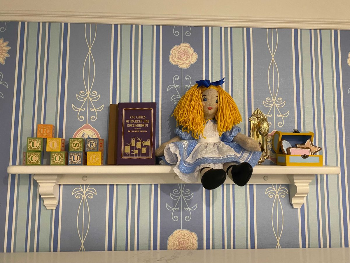 Another shelf features a doll resembling Alice, blocks spelling out “curiouser,” and other subtle nods to the film.