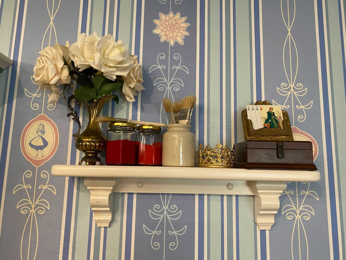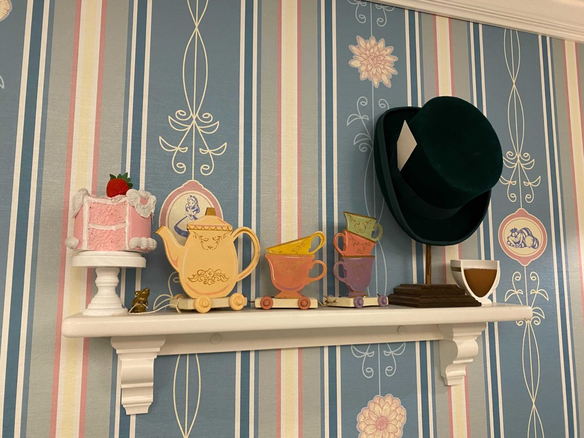 A shelf in the changing room features teacups and the Mad Hatter’s iconic hat.