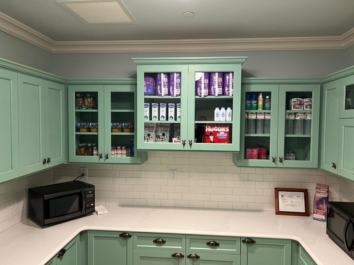 A small kitchen provides a sink and microwaves. Families can also purchase forgotten supplies here, such as formula, baby food, bottles, and more.