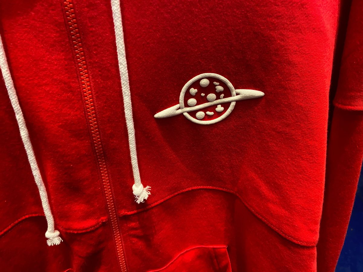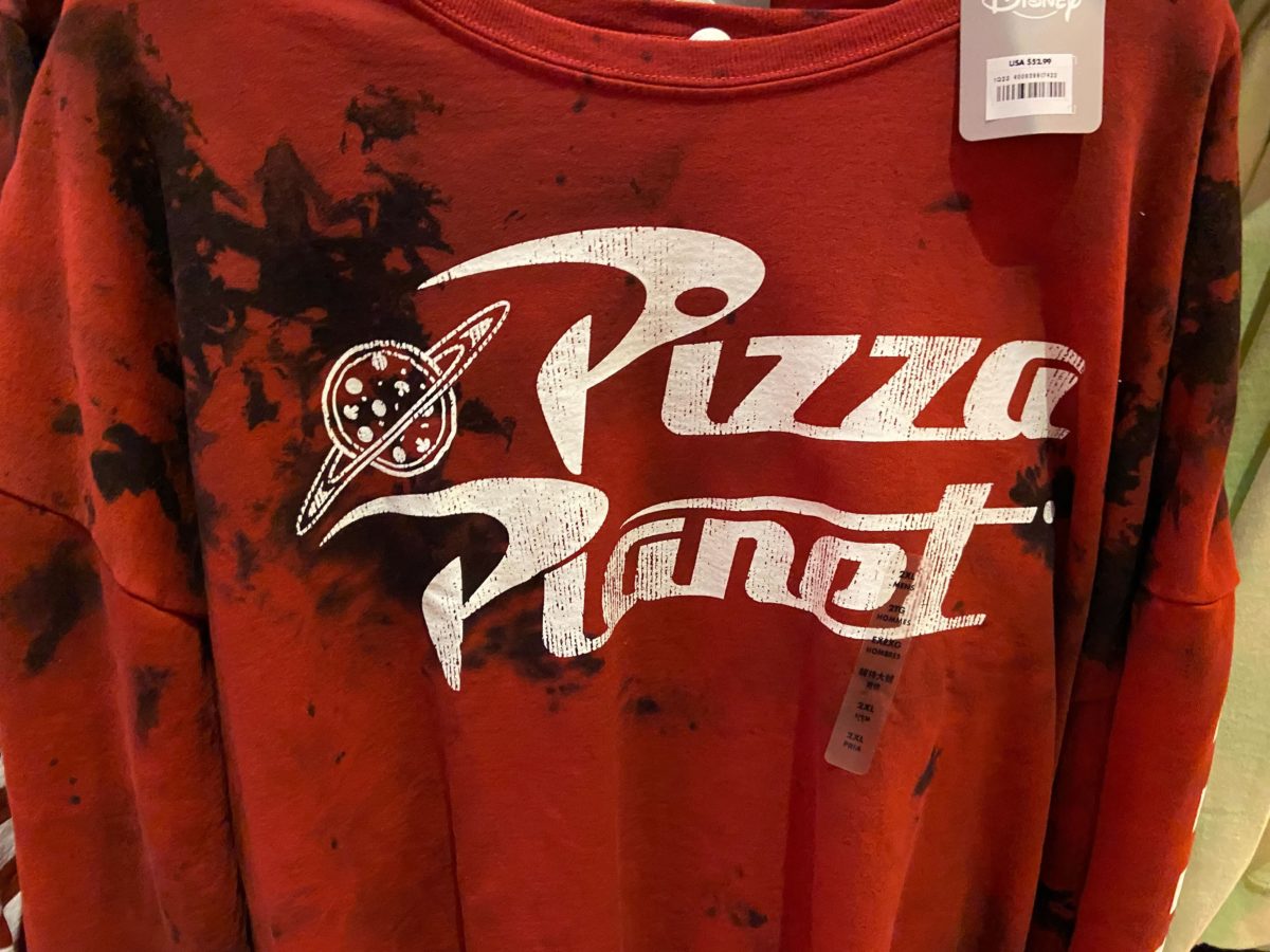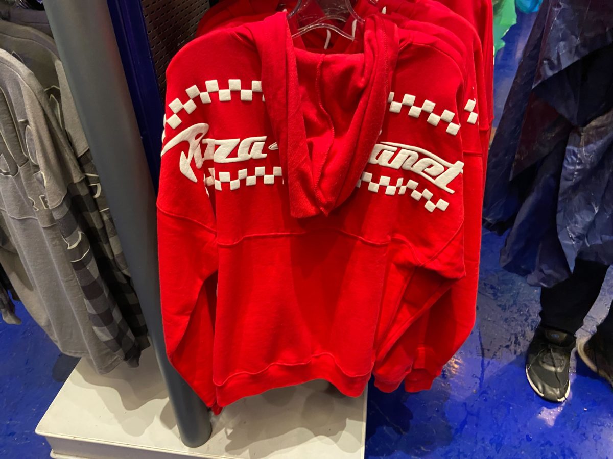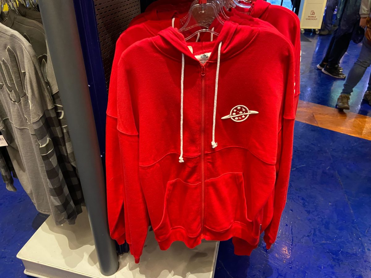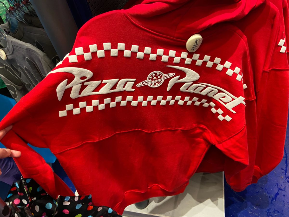 At Star Trader in Tomorrowland, we spotted this hooded Pizza Planet zip-up Spirit Jersey, which we first saw earlier this week at Walt Disney World. On the front it features the Pizza Planet logo with a pizza surrounded by a ring.
