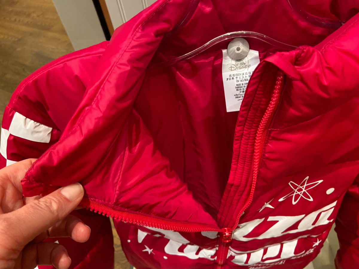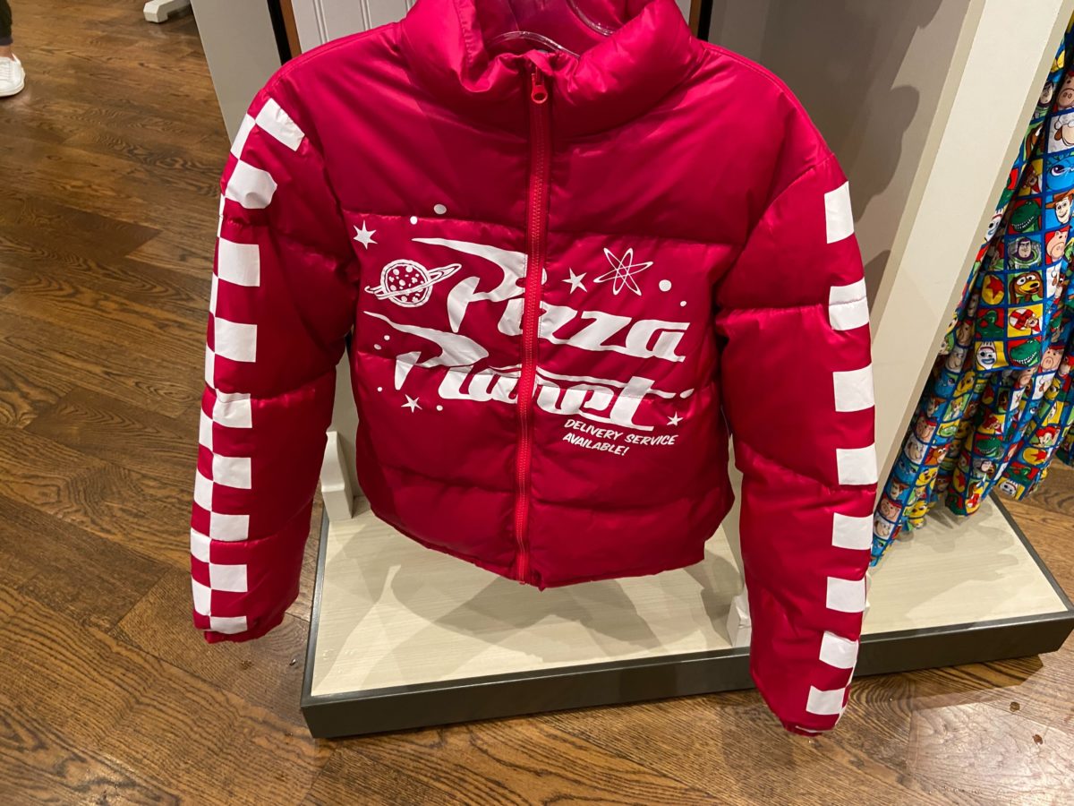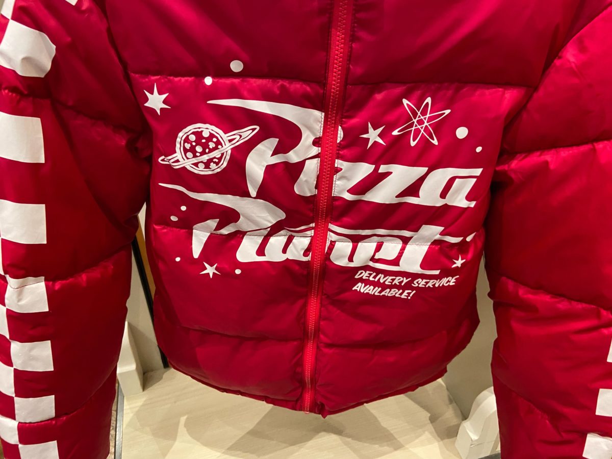 The Pizza Planet puffy jacket is of course all red with a prominent Pizza Planet logo and wordmark on the front. Icons of stars and planets surround the words, and “Delivery service available!” is written below and to the right.