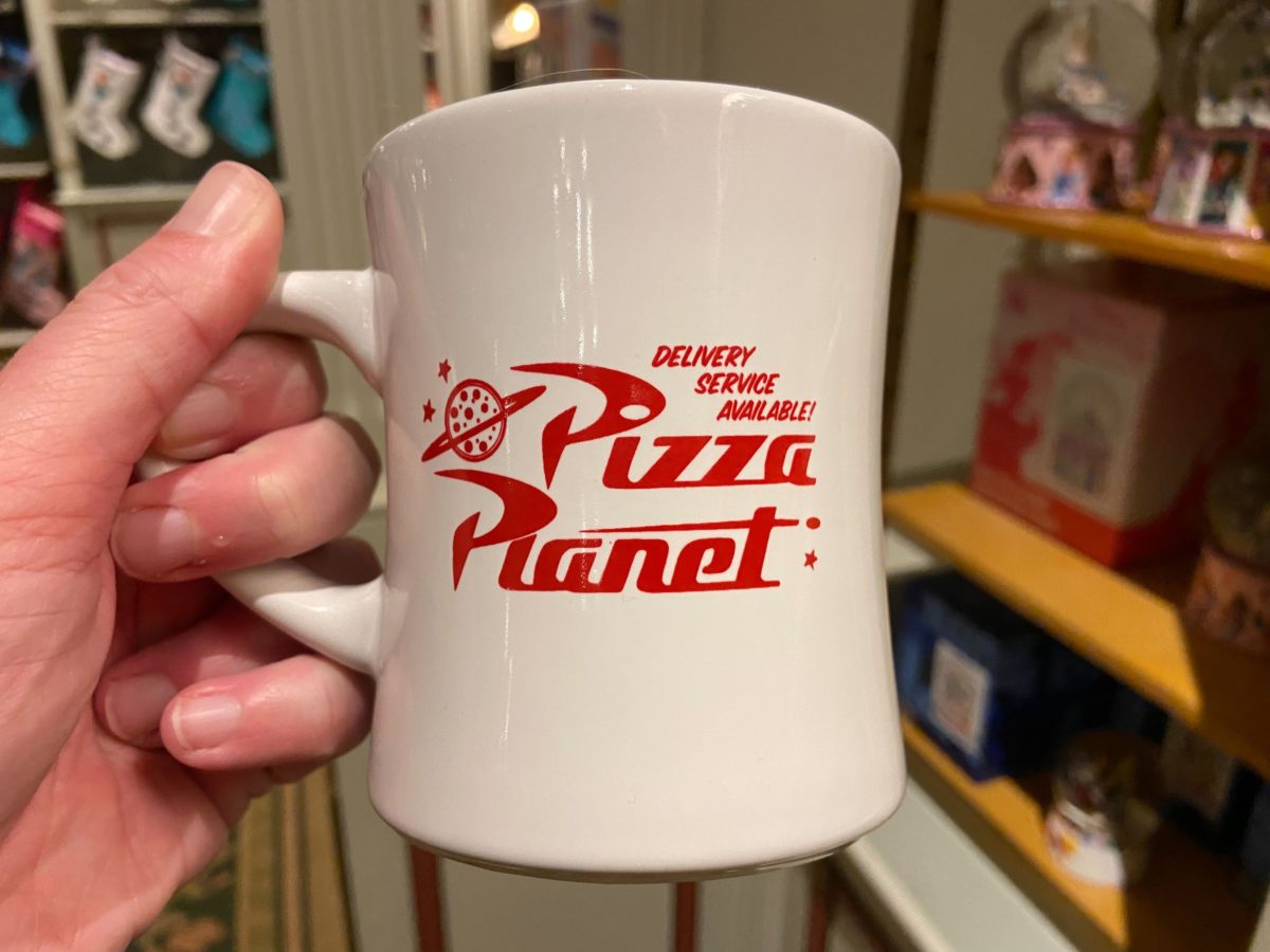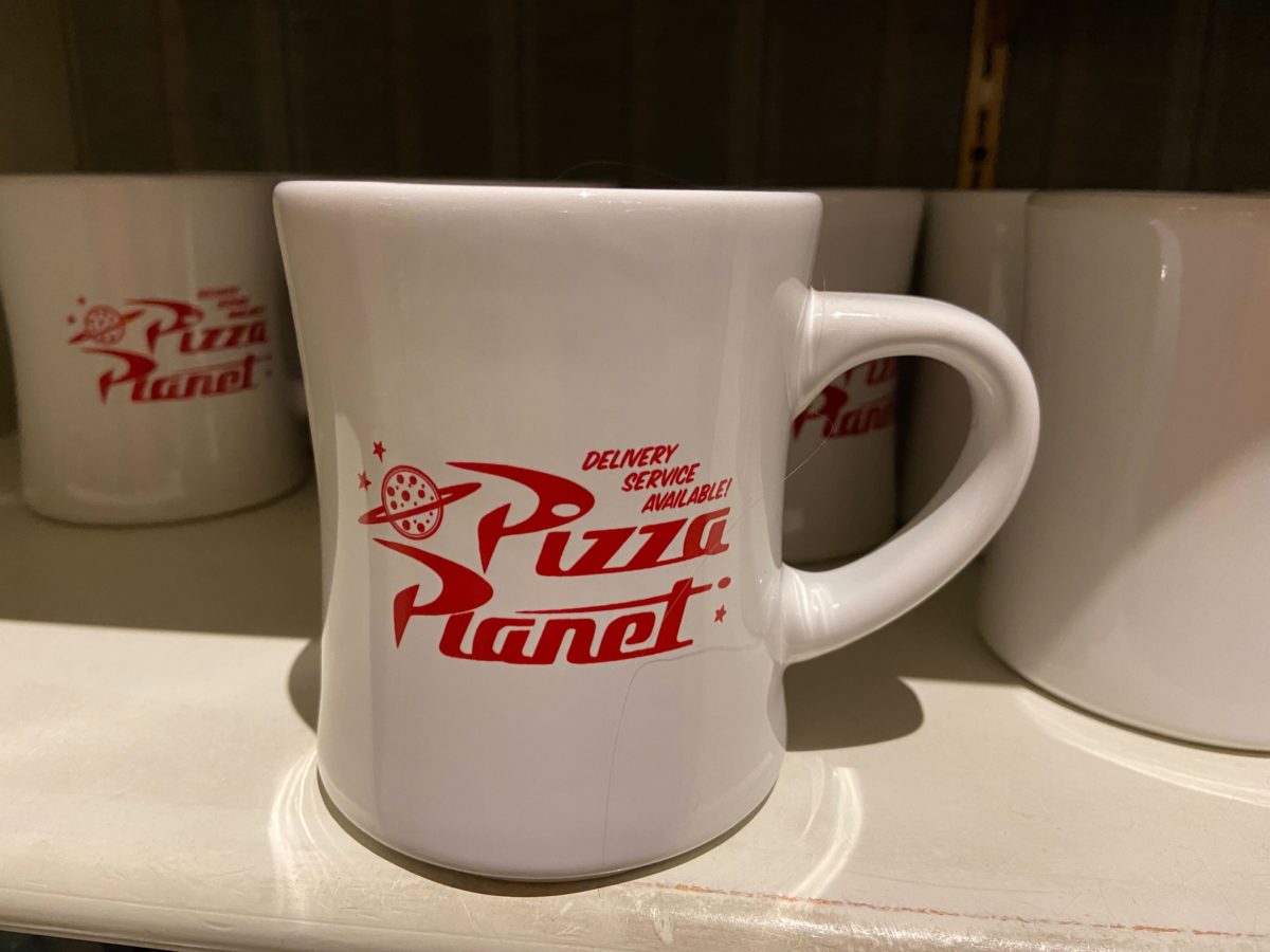 This plain white mug features the Pizza Planet logo and wordmark again, but on a white background with red text instead of white text on a red background. We found this at China Closet on Main Street U.S.A.