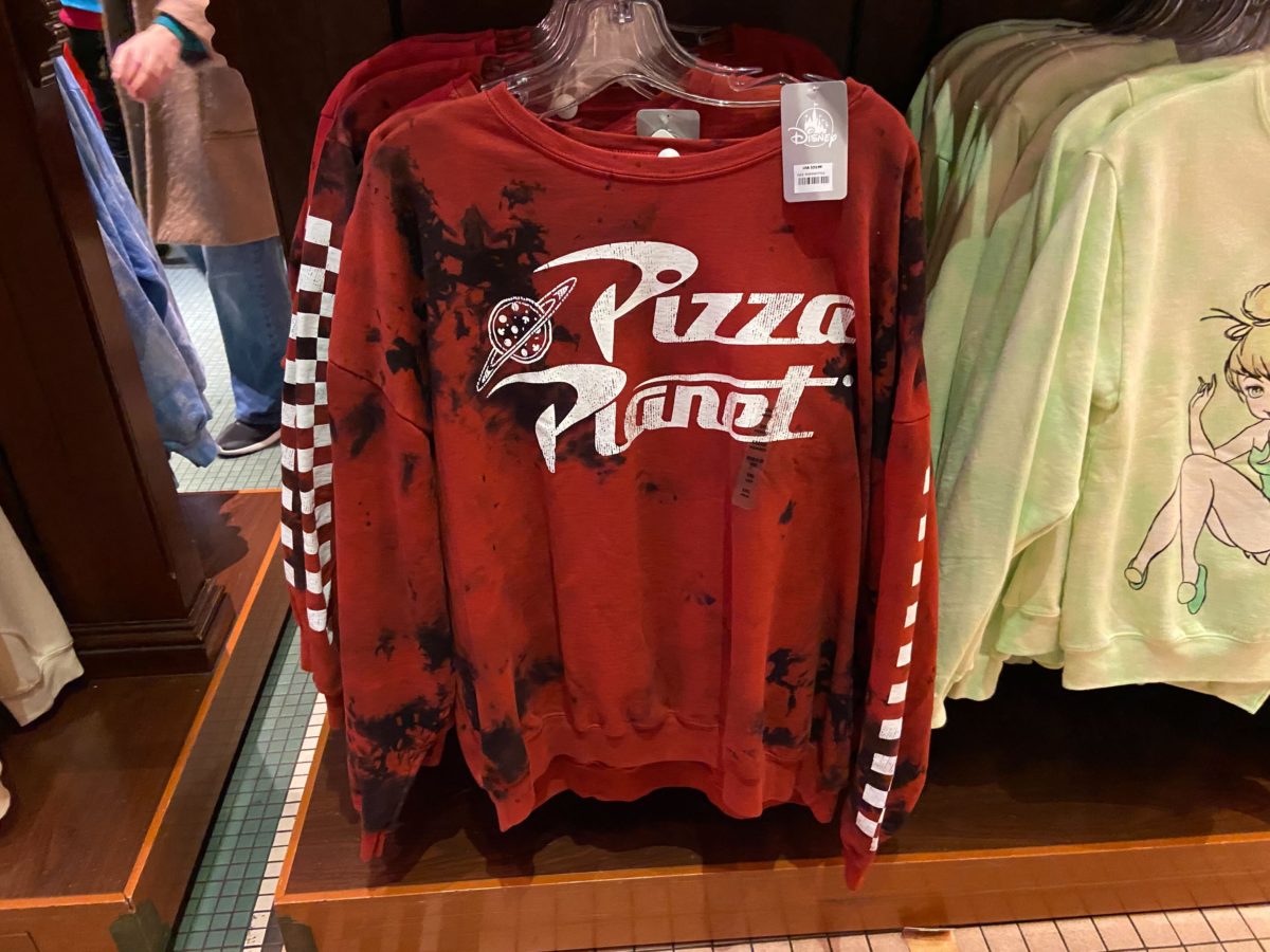 Over at the Emporium is this Pizza Planet sweater, which features the wordmark and logo on the front side. The sweater itself is red with black dye around.