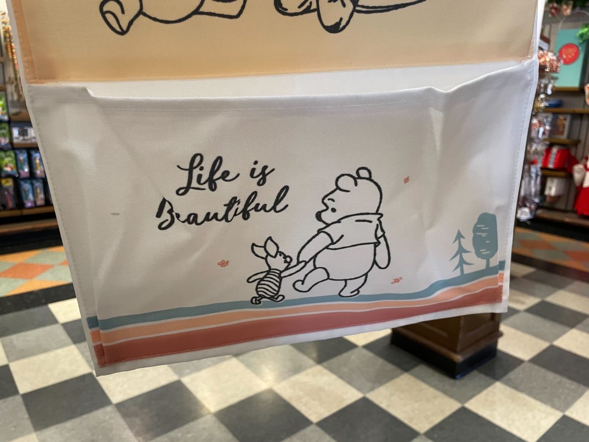 On the bottom pocket, it says “Life is beautiful” with an illustration of Winnie the Pooh and Piglet again.