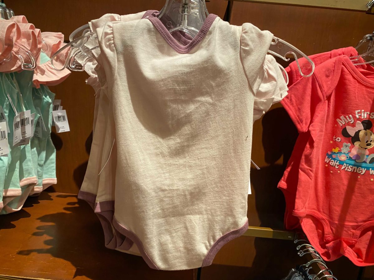 The onesie has ruffled armholes, and purple piping accentuates the neckline and leg holes.
