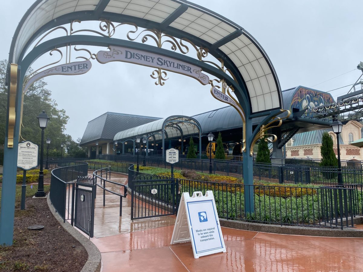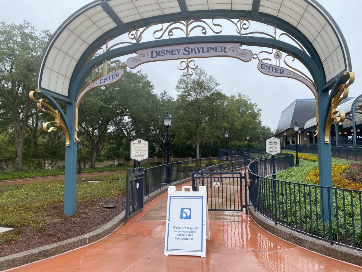A sign outside the station reminds guests that masks are required while onboard the Disney Skyliner.