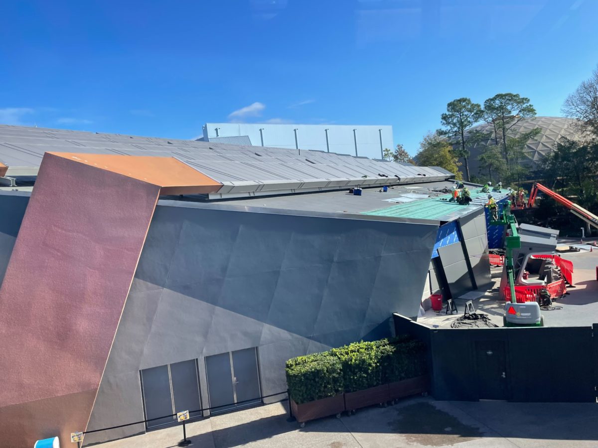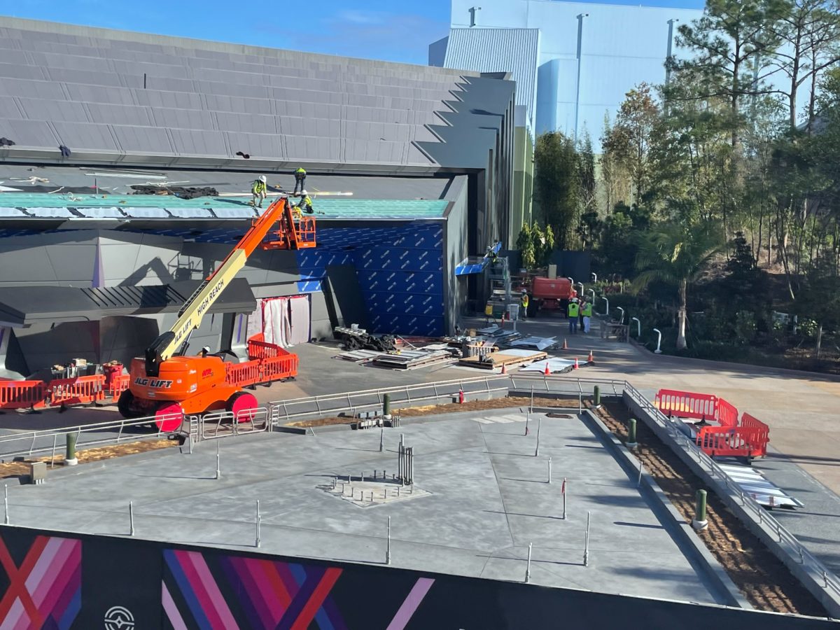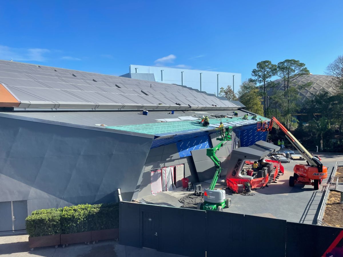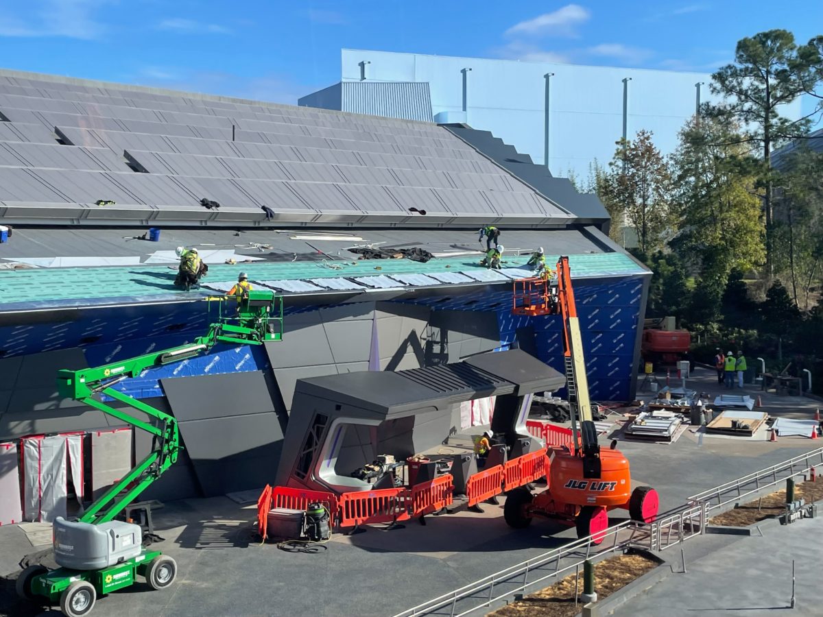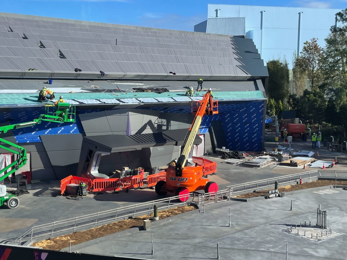 Today, we saw crew members working on the roof of Cosmic Rewind, where there are green sheets lining the edge.