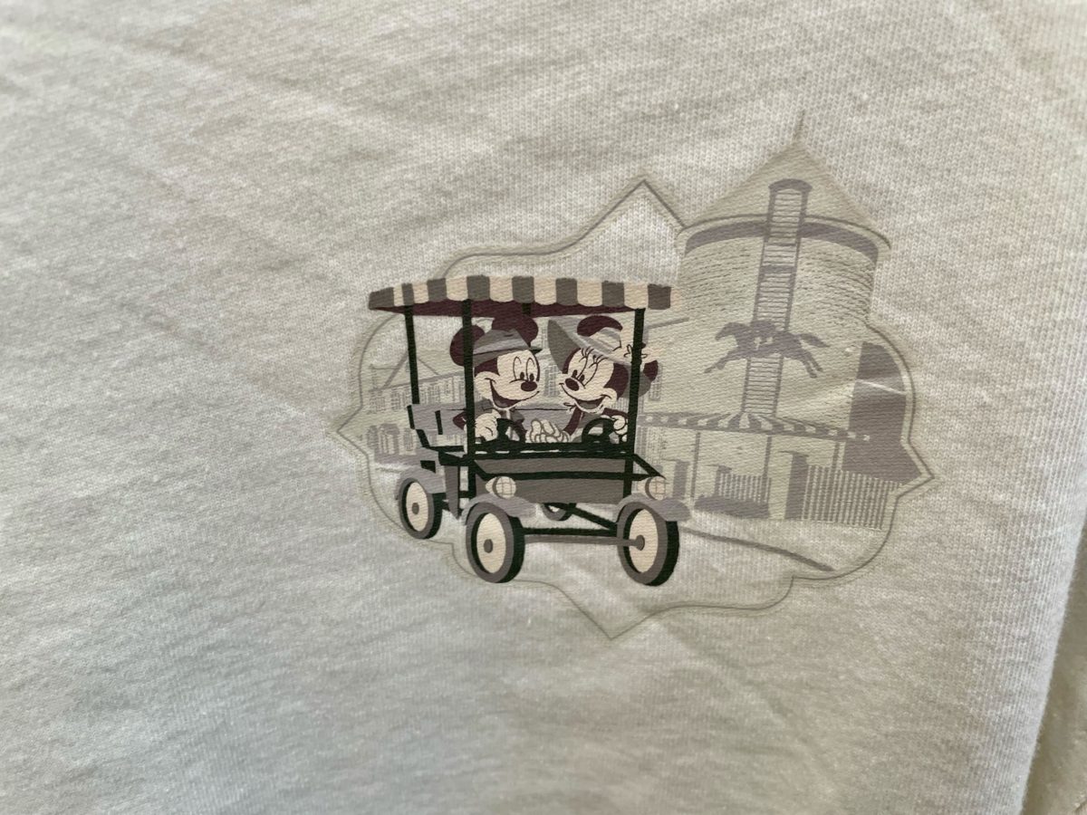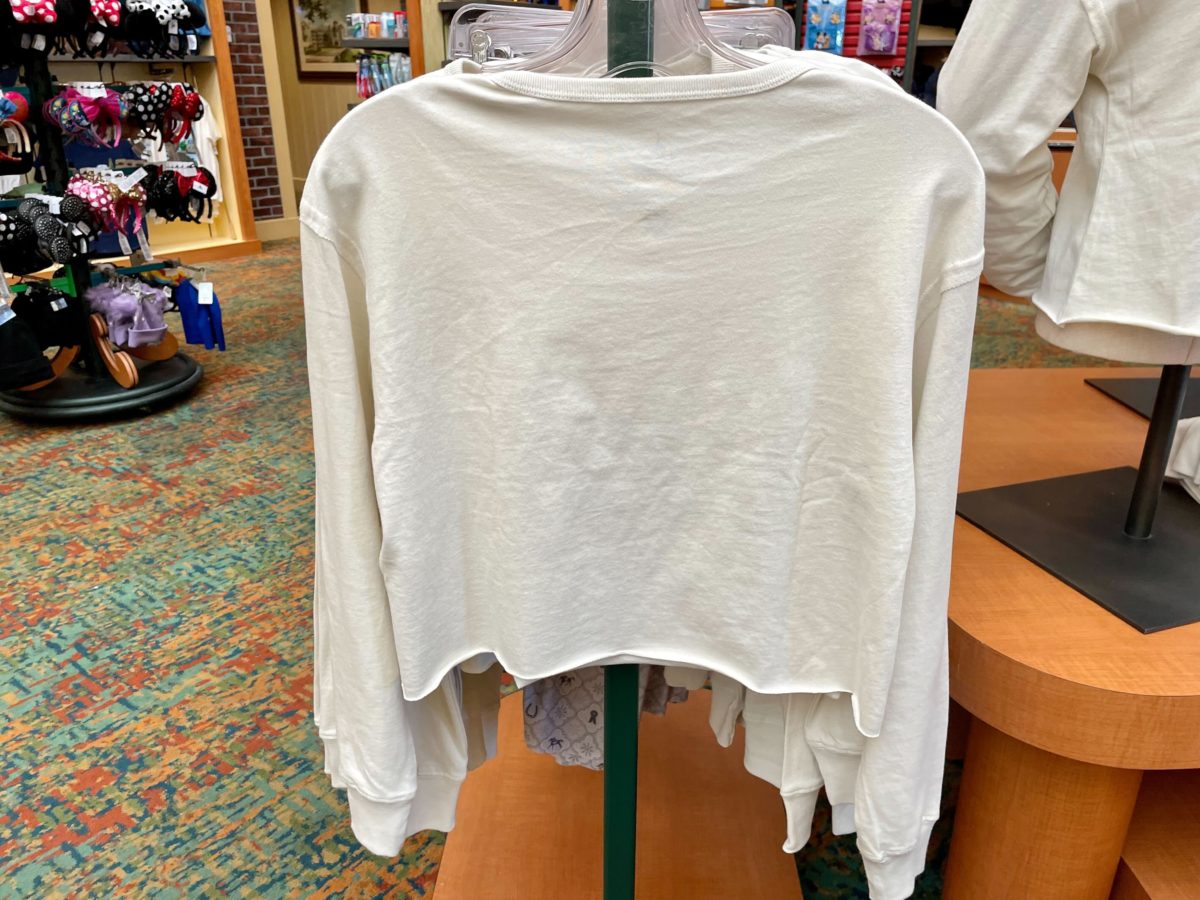The new white long-sleeve crop top features Mickey & Minnie enjoying a golf cart ride through the resort.