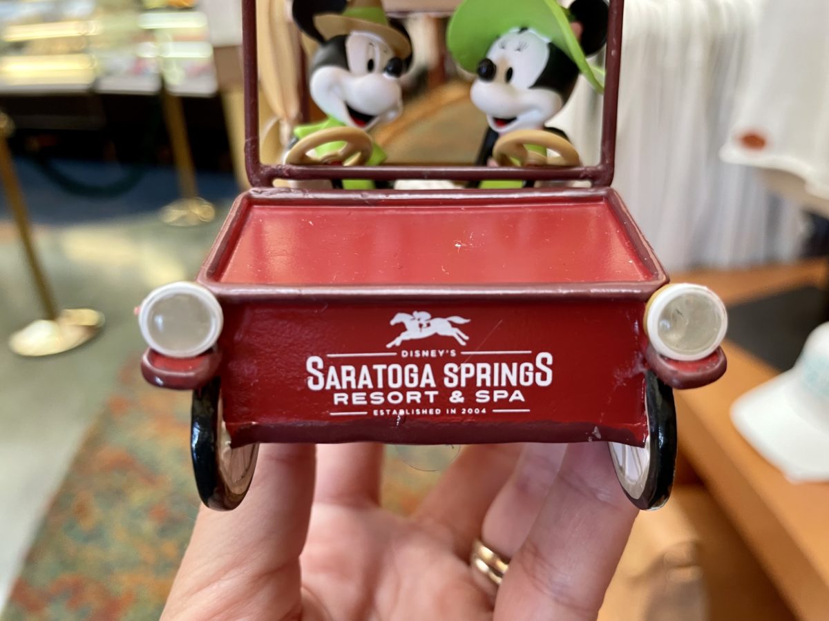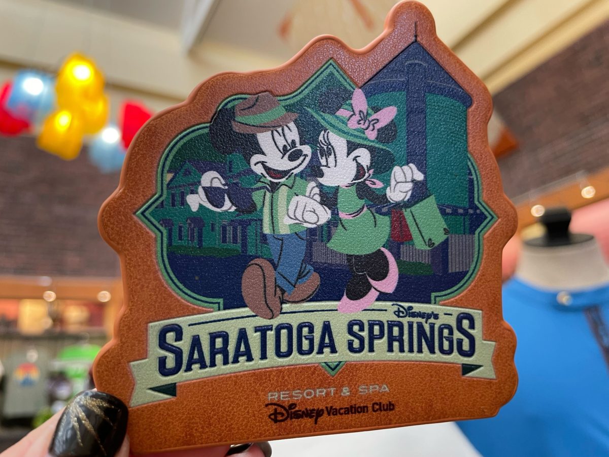 The magnet is leather-esque and features Mickey & Minnie dressed for their Saratoga Springs vacation.