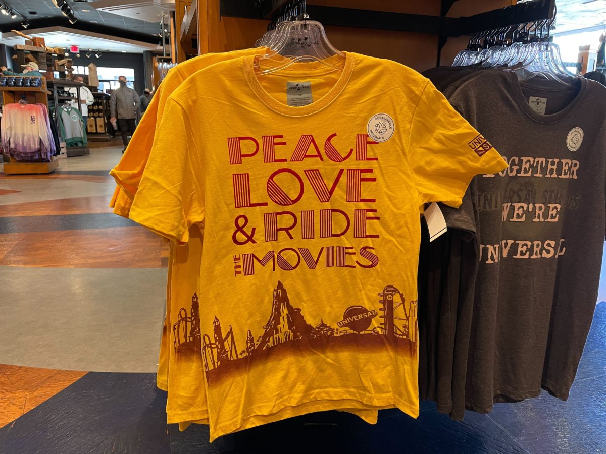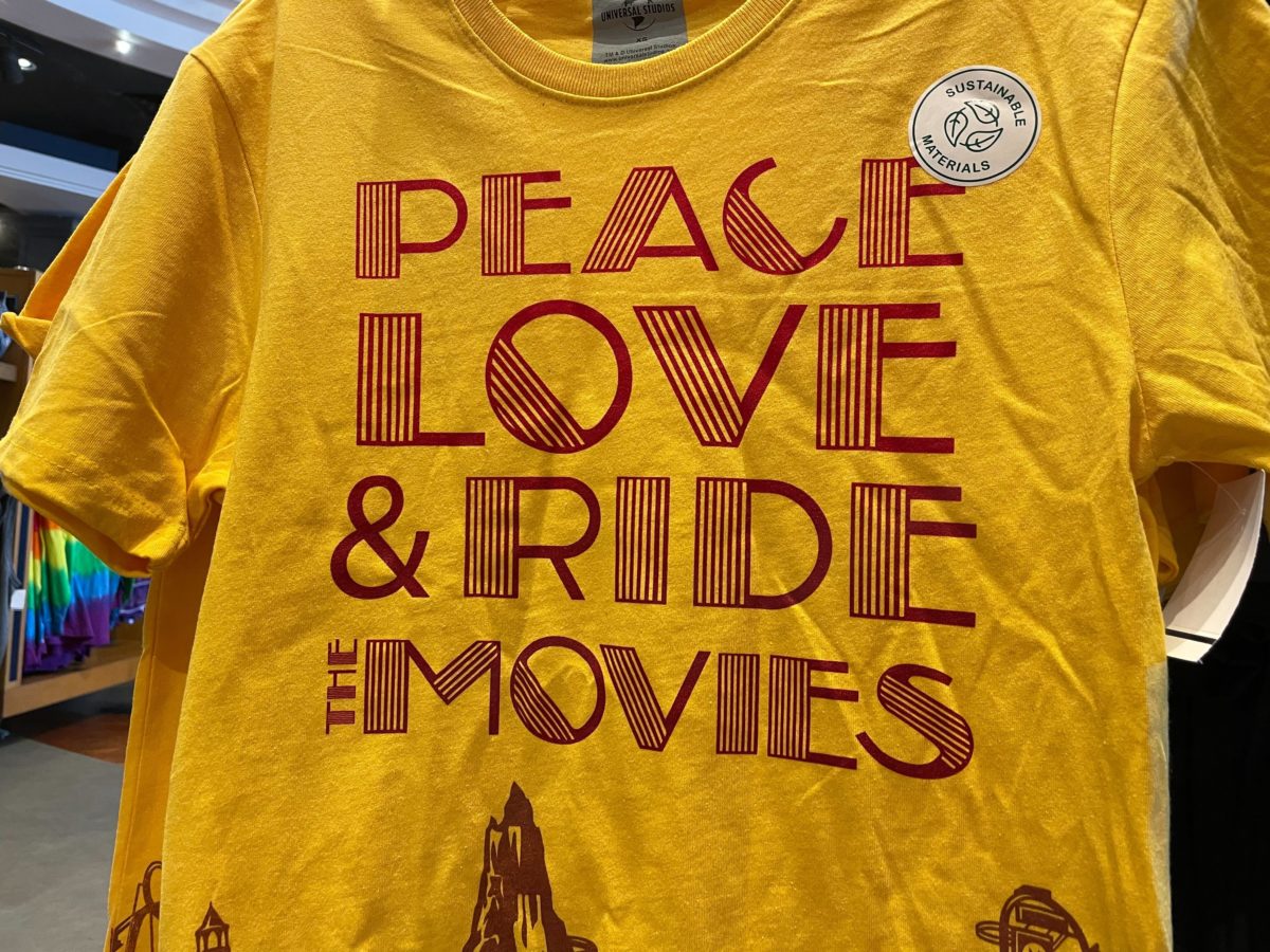 We saw this cute, new “Peace, Love & Ride the Movies” t-shirt at Universal Orlando Resort today.