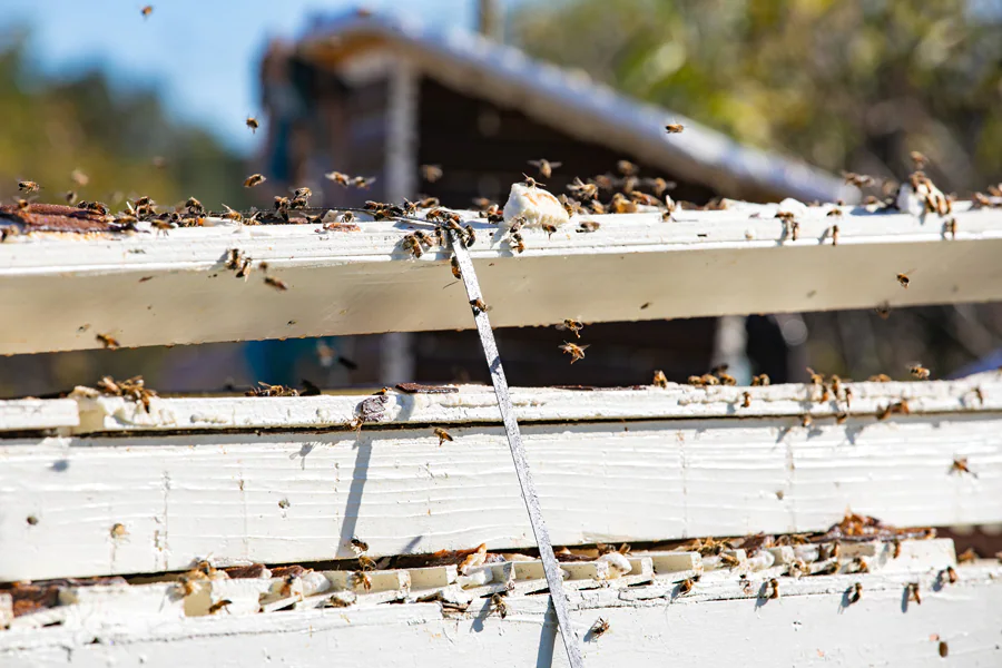 Thousands of local bees then get to visit the farm and clean the sugar off the wooden frames. This keeps them well-fed during the winter when food is harder to come by.