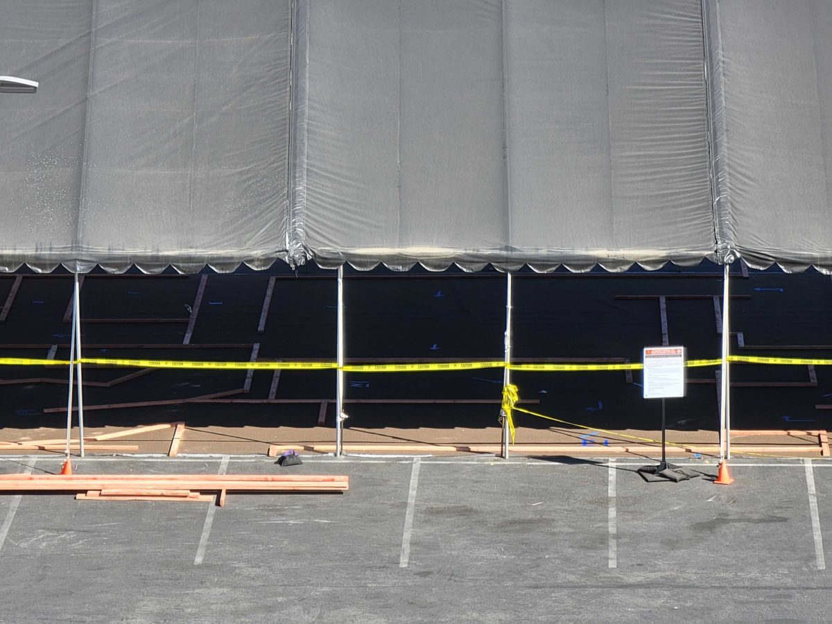 The black tent looks mostly empty underneath, with the exception of what looks like some foundational pieces for a possible maze. There is also some yellow caution tape wrapped around the poles of the tent.