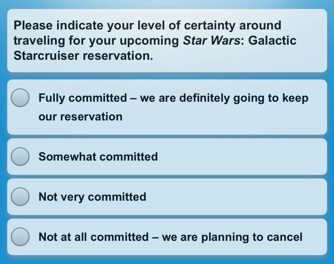 A lengthy survey distributed to guests with reservations aboard the Star Wars: Galactic Starcruiser has asked a number of questions about guests’ commitment to their Star Wars: Galactic Starcruiser reservation, incluidng whether will participate in the themed activities, whether they will wear costumes, and more as the immersive two-night experience prepares to launch at Walt Disney World.
