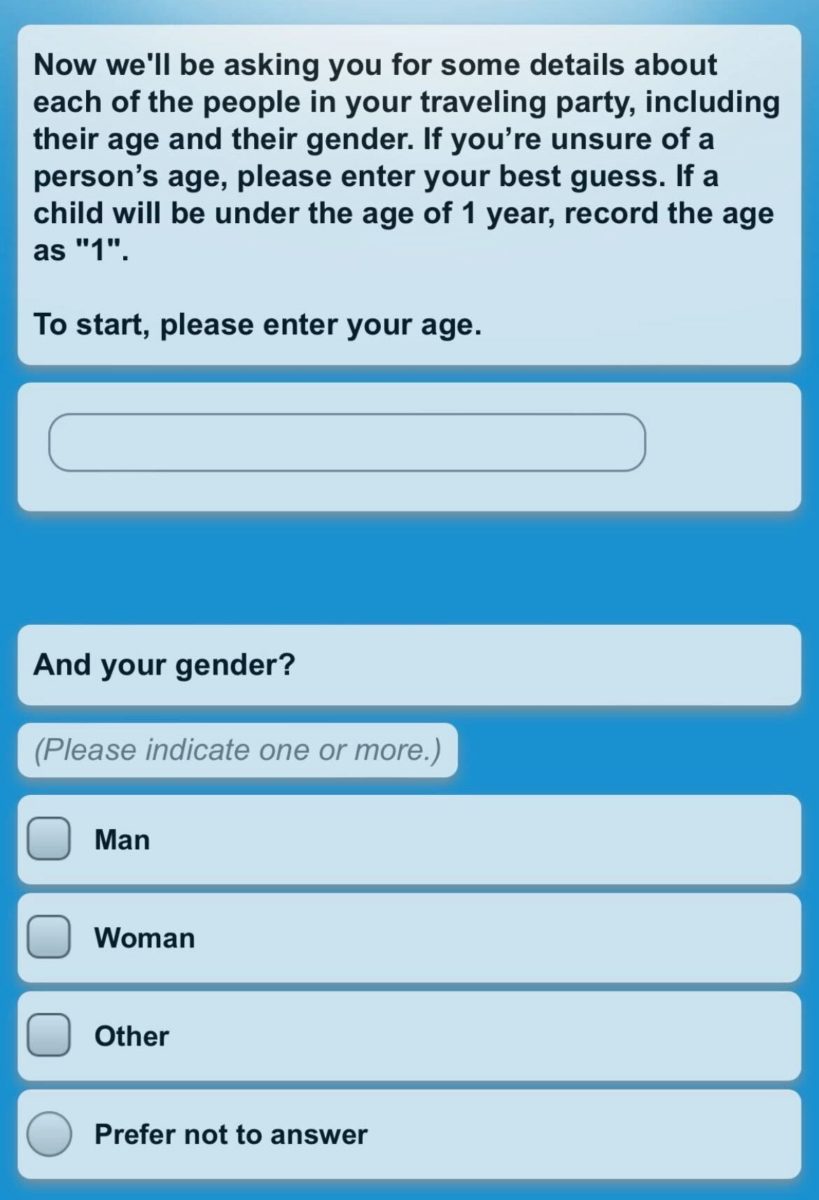 There are a few boilerplate questions, like who they are planning to travel with. Rooms are not sold for individual guests.