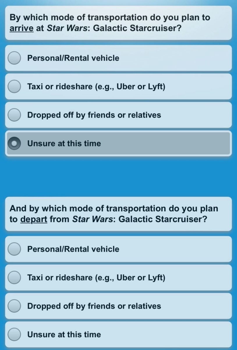 Finally, guests are asked some boilerplate demographic questions along with their mode of transportation for boarding and leaving the Star Wars: Galactic Starcruiser, and how many in their travel party will experience it.