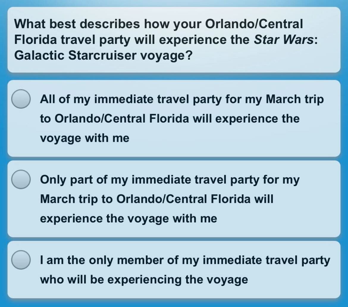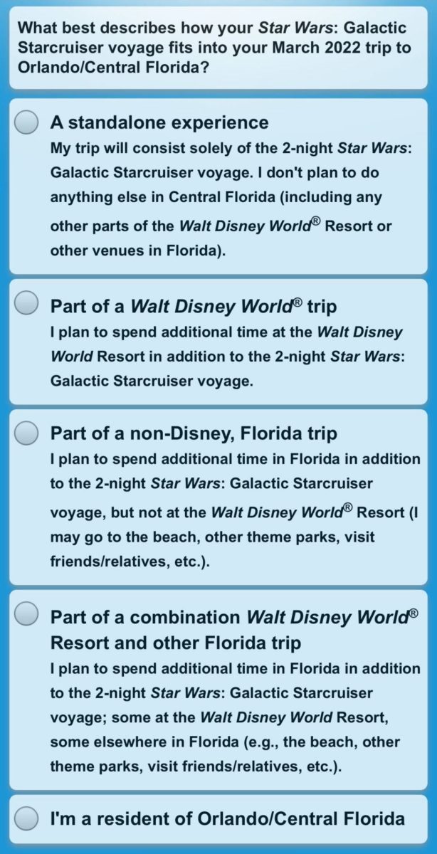Next, guests are asked where their Star Wars: Galactic Starcruiser voyage fits within their vacation to Florida and Walt Disney World.