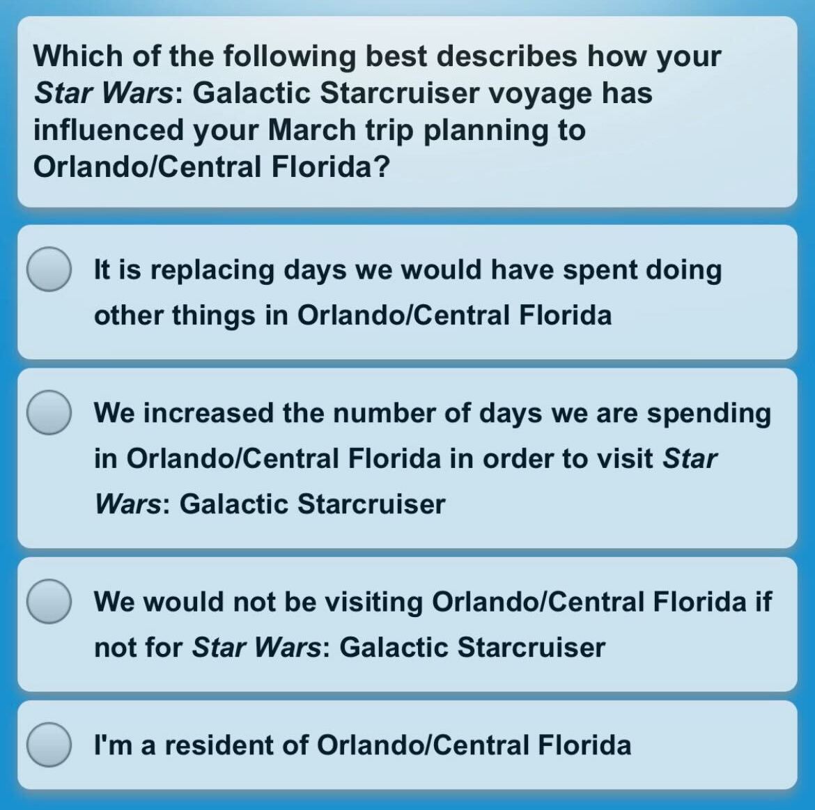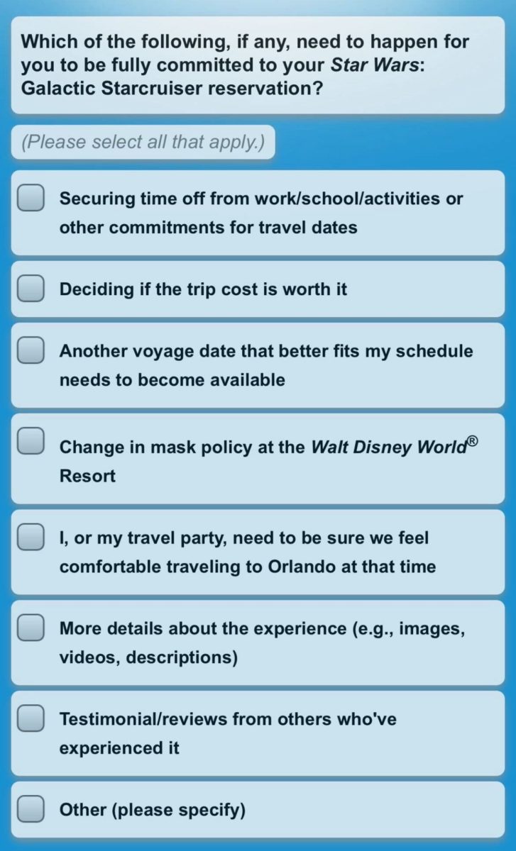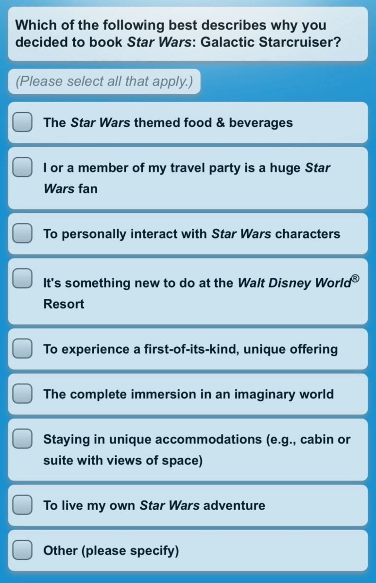 The first question, multiple choice, asks why guests booked in the first place, giving reasons from being a fan of “Star Wars” to “It’s something new to do at Walt Disney World Resort”.