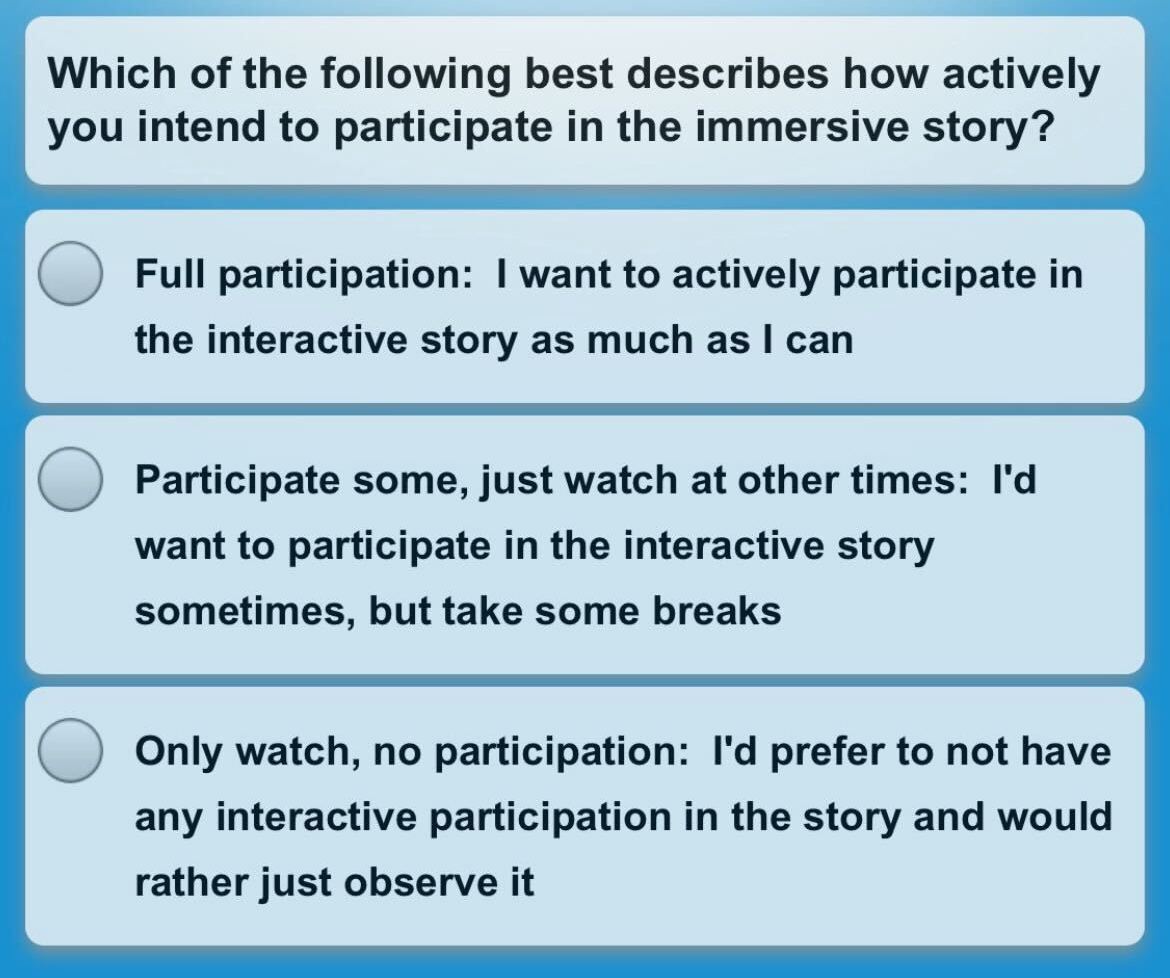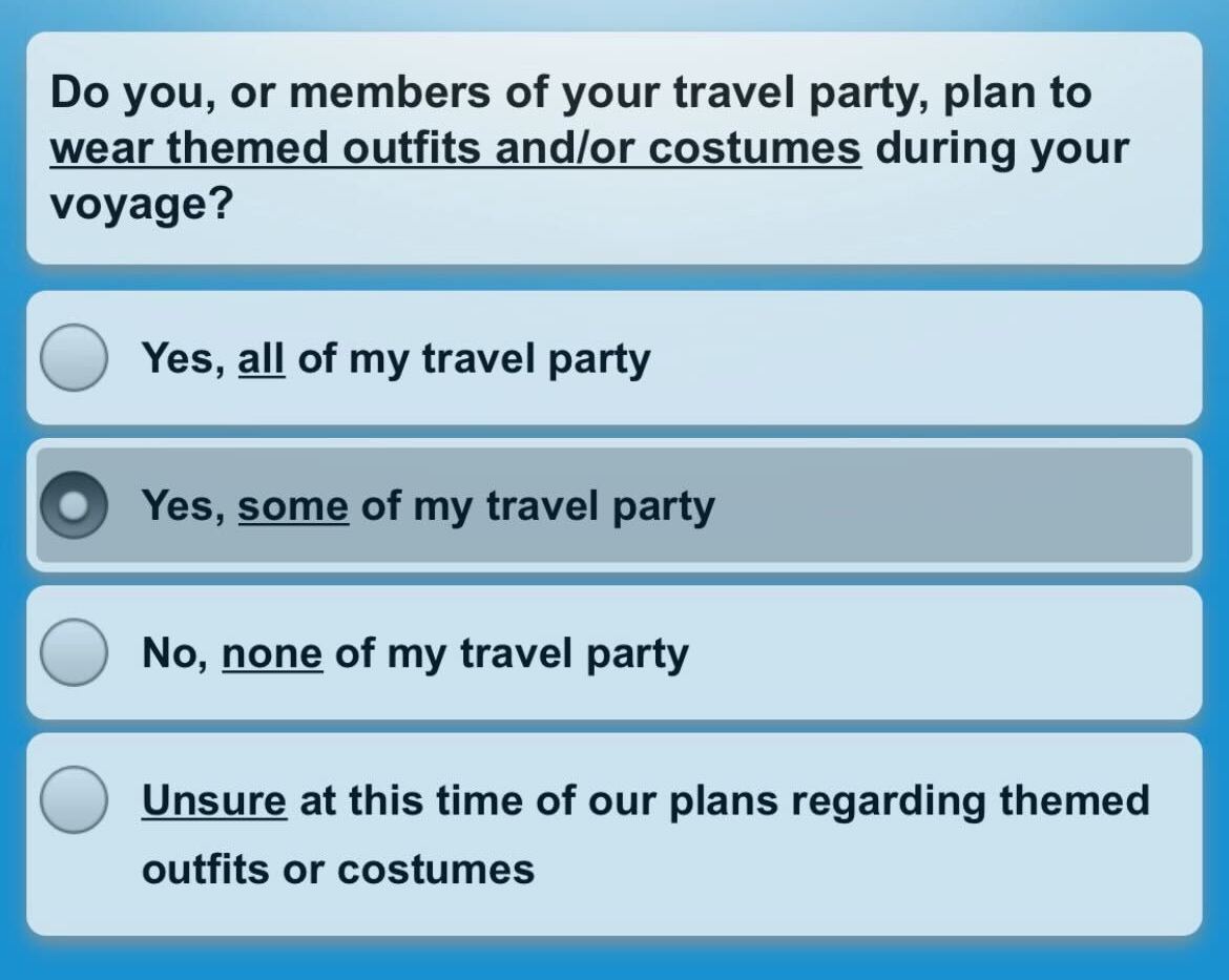 Two interesting questions ask whether guests will wear costumes aboard, and how actively they plan to participate in the interactive story elements of the voyage.