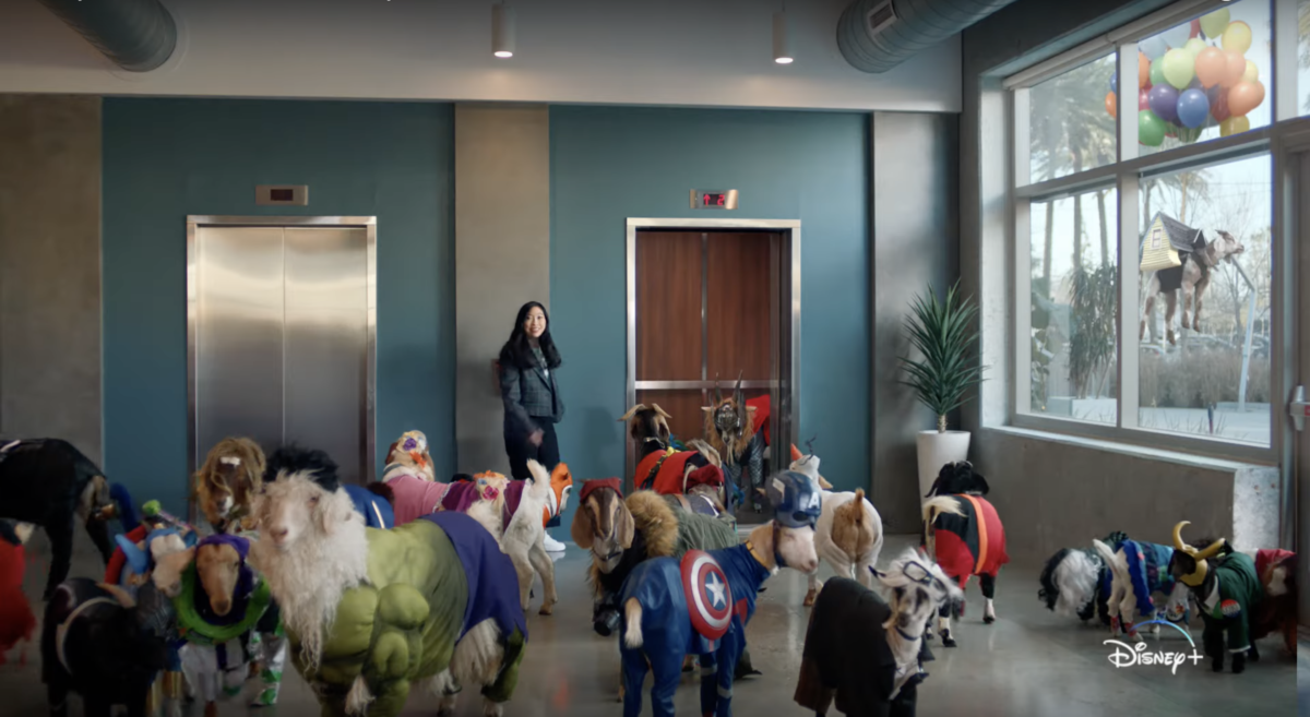 The spot features Awkwafina walking around the Disney+ offices with goats dressed to represent different Disney+ films, shows, and franchises. Goats are dressed as characters from “The Lion King”, “Star Wars”, “Avengers: Endgame”, “Encanto”, “Cruella”, “The Simpsons”, “Loki”, “Luca”, “Up”, and several others.