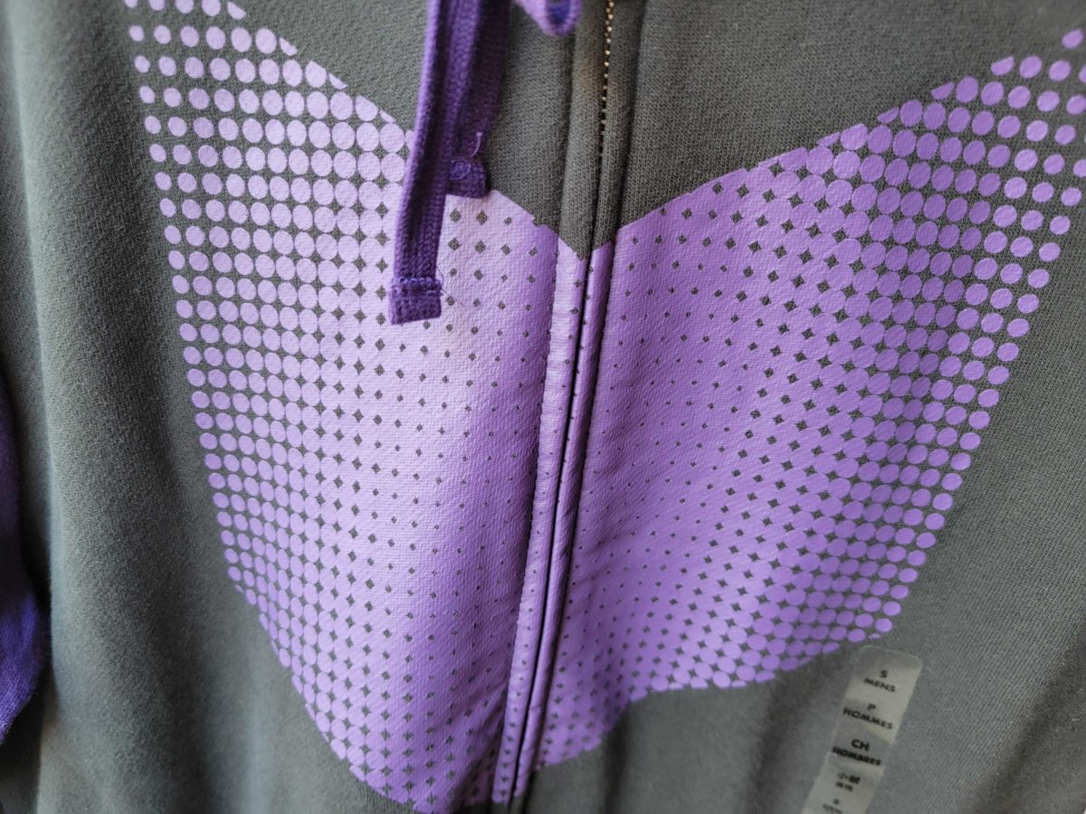 It has the Hawkeye icon on the front in purple. The sleeves are also purple.