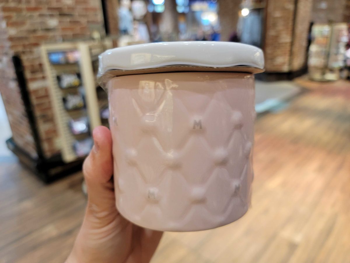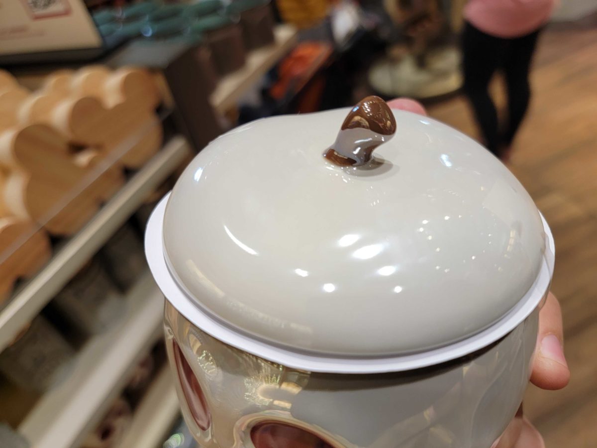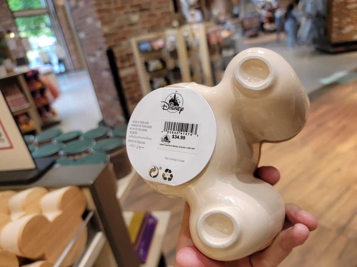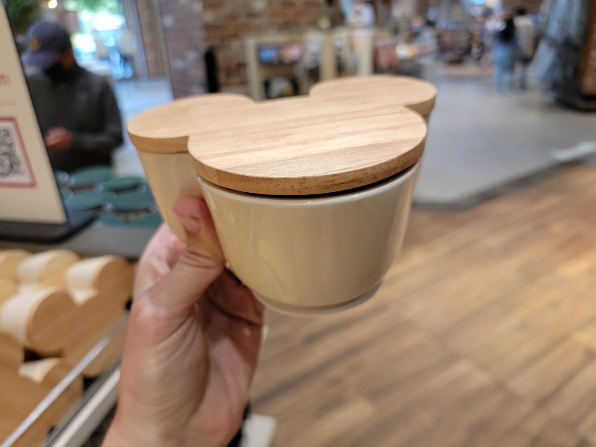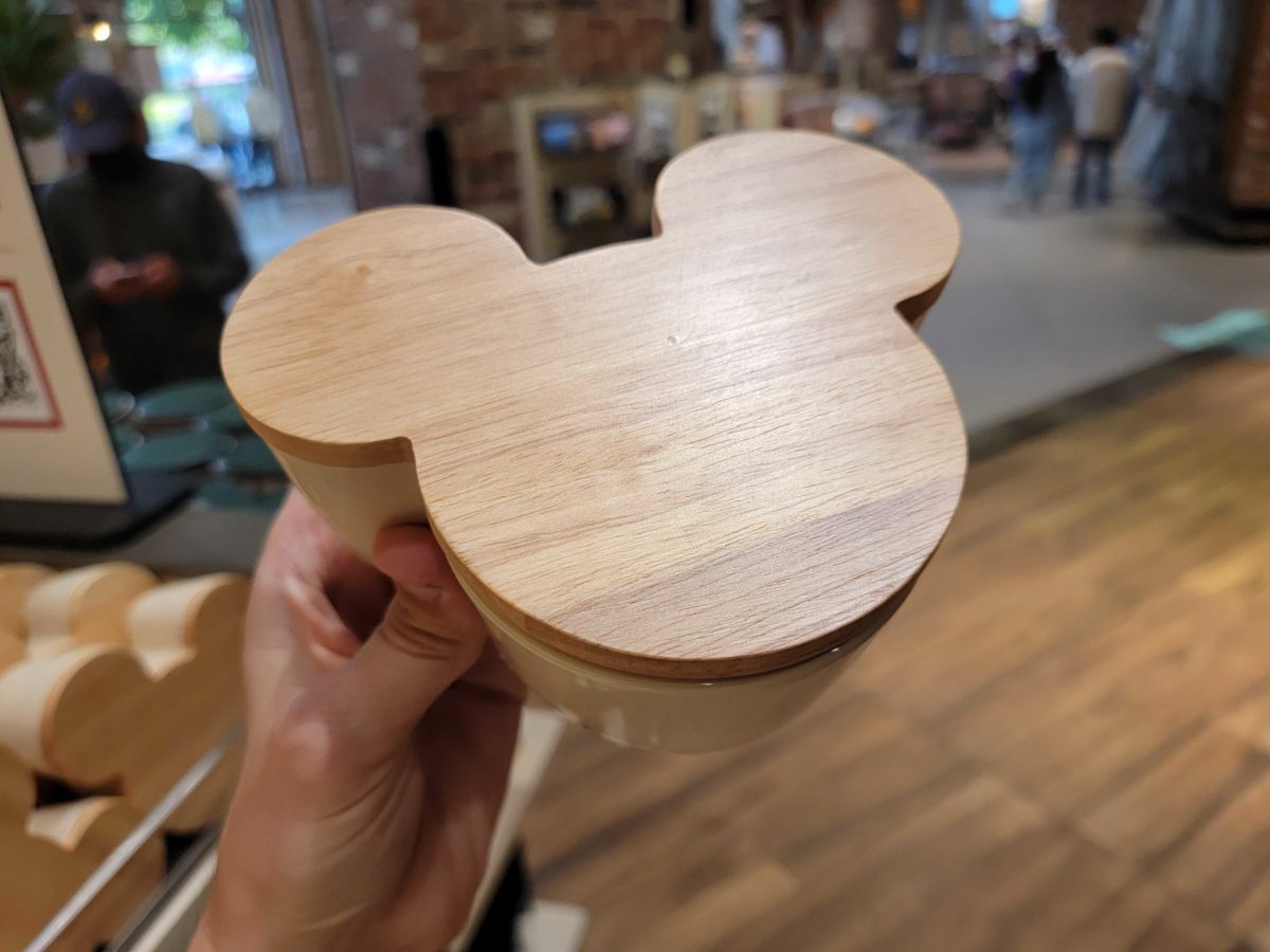 It is shaped like Mickey’s head, with a ceramic bottom and wood finish lid.
